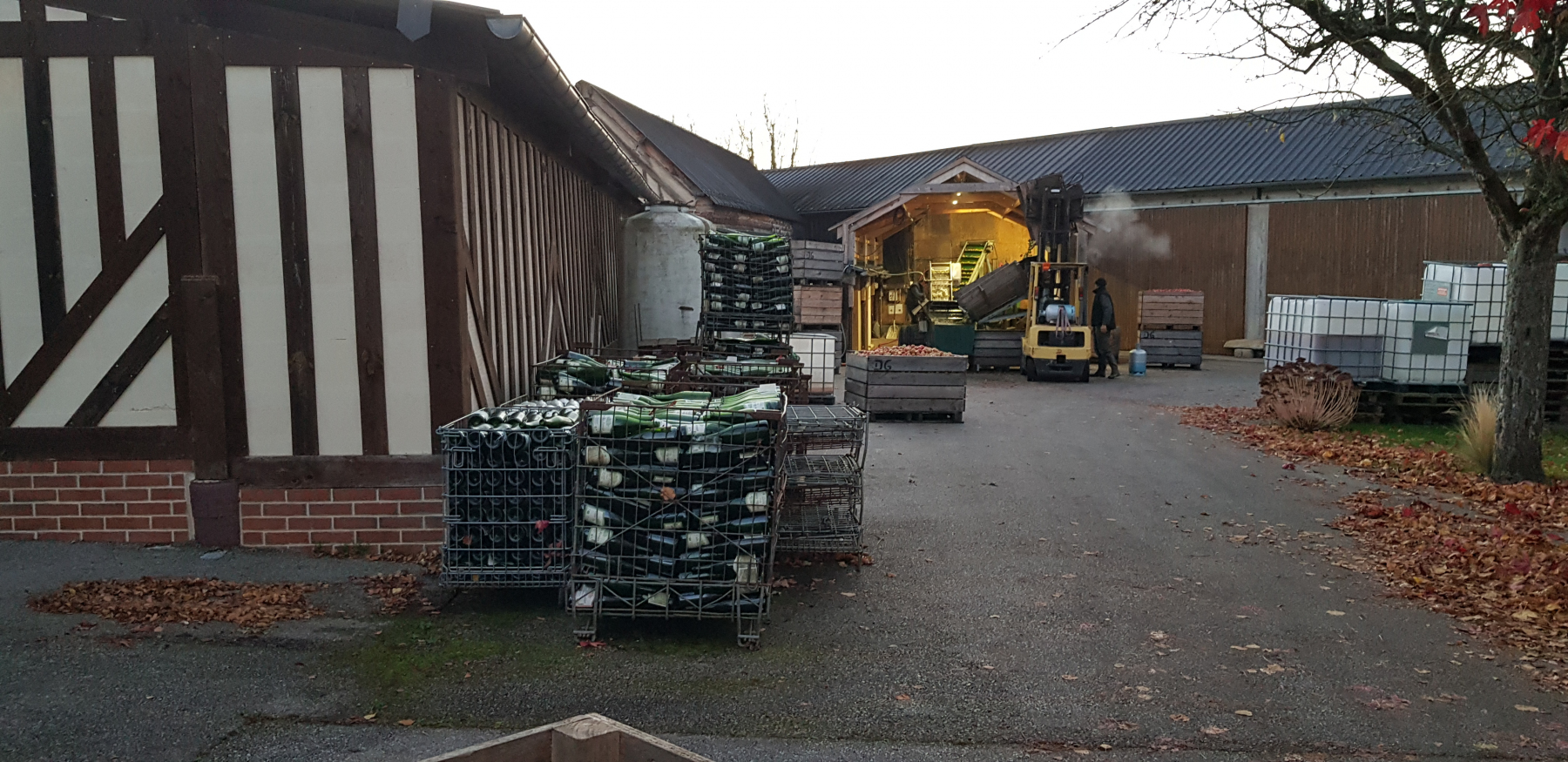 Nach Käse kommt wieder Cidre bzw. Calvados. So fahren wir einfach mal Richtung eines Schildes, dass zu einem Stellplatz führen soll. Die Straße wird immer enger, es geht bergauf zwischen Apfelbäumen und Kühen und plötzlich stehen wir vor dem Haus des Cidre Produzenten Didier Gautard. Wir parken vor einem Seil, welches die Zufahrt zu dem offensichtlichen Stellplatz blockiert. Wir wissen nicht direkt ob wir willkommen sind und sehen hinten einen Gabelstapler. Der Fahrer winkt uns, springt vom Stapler und legt das Seil beiseite.