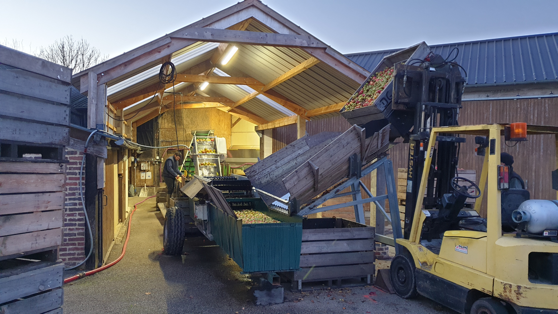 Nach Käse kommt wieder Cidre bzw. Calvados. So fahren wir einfach mal Richtung eines Schildes, dass zu einem Stellplatz führen soll. Die Straße wird immer enger, es geht bergauf zwischen Apfelbäumen und Kühen und plötzlich stehen wir vor dem Haus des Cidre Produzenten Didier Gautard. Wir parken vor einem Seil, welches die Zufahrt zu dem offensichtlichen Stellplatz blockiert. Wir wissen nicht direkt ob wir willkommen sind und sehen hinten einen Gabelstapler. Der Fahrer winkt uns, springt vom Stapler und legt das Seil beiseite.