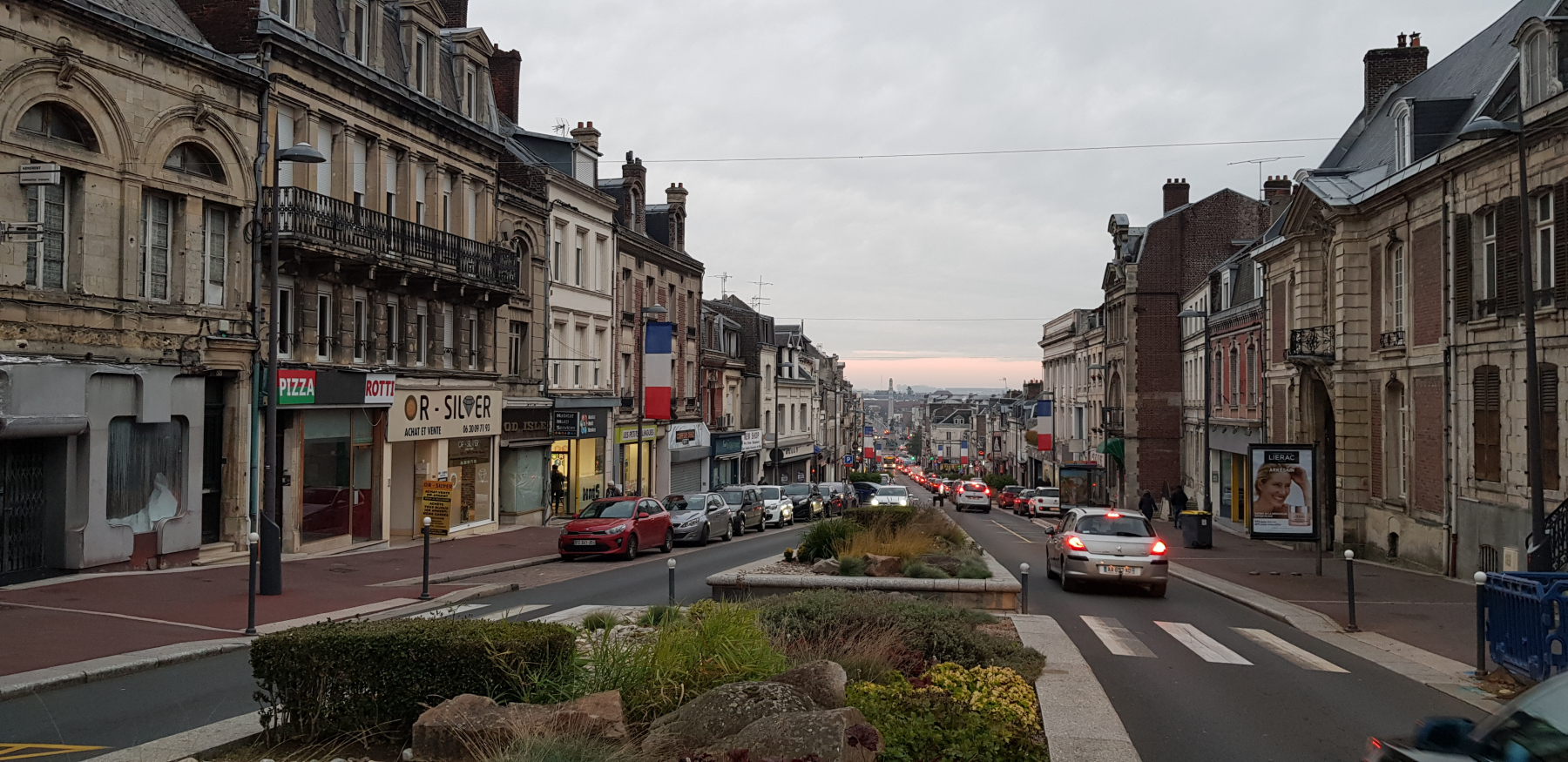 Bei einem Spaziergang kommen wir dem Ort wieder ein wenig näher. Unseren ersten Crêpe in Frankreich dieses Jahr essen wir direkt am sehr großen Marktplatz. Dazu einen französischen „vin Chaud“ – Glühwein. Crepe ist in Ordnung – Wein nur heiß und schrecklich. Der Weihnachtsmarkt ist aufgebaut aber noch nicht offen. Ein Kriegerdenkmal, ein Art-Déco-Haus und die historischen Gebäude auf dem Place de l´Hotel de Ville. Alles ganz nett.