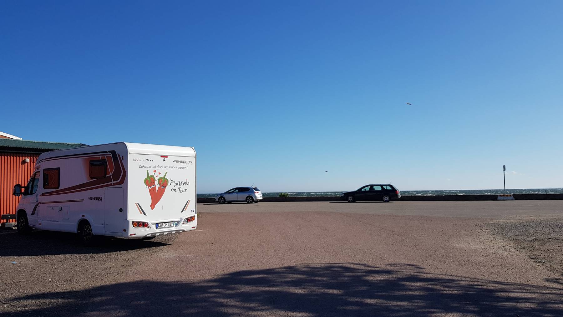 Wir haben uns einen Stellplatz im Außenhafenbereich hinter Agrar-Silos ausgesucht, direkt an der heute etwas stürmischen See. Das Besondere ist hier nicht der Platz, sondern ein dort stehendes Wohnmobil mit den „Pepperonis on tour“. Wer sind die Pepperonis? Das wissen wir auch erst seit einer Woche. Seit einem Jahr suchen wir über youtube schon mal nach anderen, die ähnliches wie wir machen. So sind wir letzte Woche auf die beiden geschätzten Mittfünfziger gestoßen. Sie wollten sich ein Jahr Auszeit nehmen um nach Schweden zu fahren und wollen jetzt hier seßhaft werden und dokumentieren das alles in wöchentlichen Videos. Ist schon witzig.