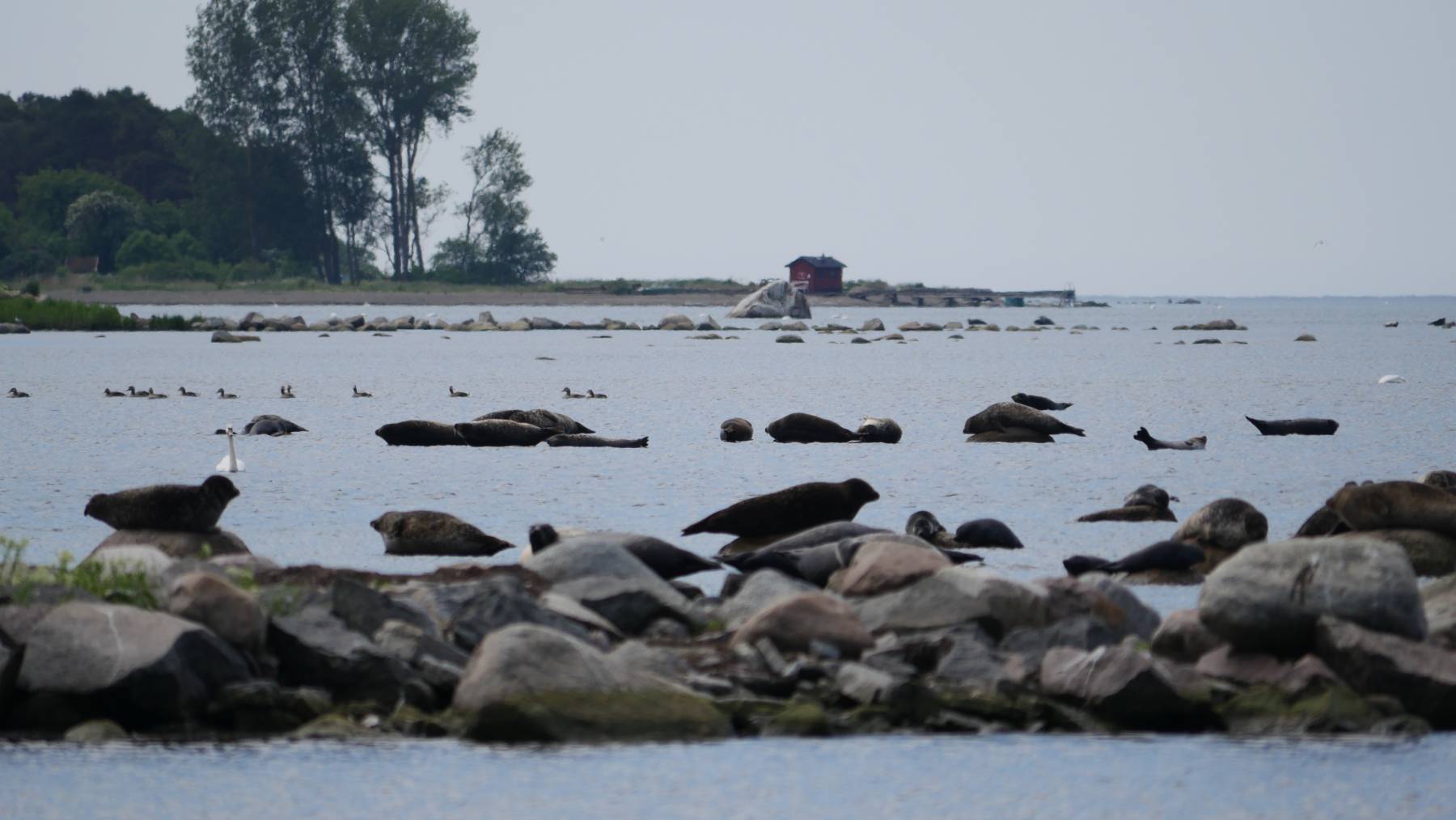 Bei einem Strand mit Vogelbeobachtungsturm entdecken wir Seehunde. Leider etwas weiter entfernt, aber wir möchten nicht viel näher gehen, um sie nicht zu verschrecken.