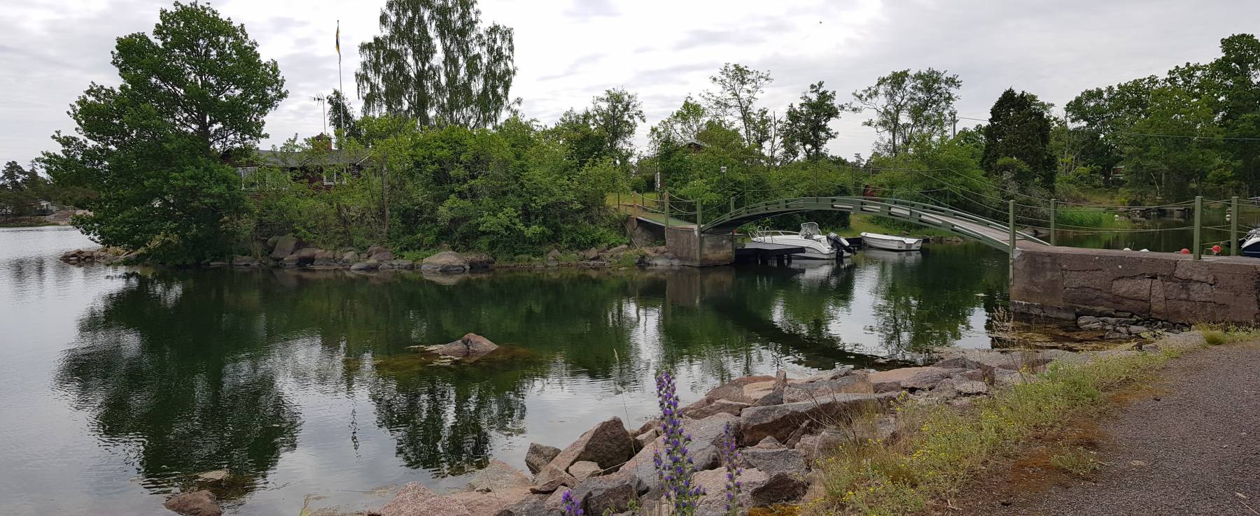 Das Thema Wäsche waschen – zum ersten Mal in Schweden – haben wir uns auch fest vorgenommen. Wie bereits erwähnt, müssen wir dafür auf einen Campingplatz. In Valdemarsvik suchen wir uns einen raus, bei dem wir auf einen Übernachtungspreis von € 20,–/Nacht kommen. Allerdings nur mit dem ACSI Rabattsystem für die Nebensaison, die hier noch bis zum 22.6. gilt. Wir fahren auf den uns zugewiesenen Platz und erfahren, dass die Waschmaschine defekt ist. Wir machen uns auf, die Shirts und Hemden mit der Hand zu waschen – „back to the roots“. Sehr ärgerlich, aber so ist es halt. Wir überlegen uns auf unserem Abendspaziergang wo wir jetzt hin sollen. Schon wieder auf einen Campingplatz oder nach Stockholm? Dort gibt es einen Waschsalon, wie wir lesen der einzige in Schweden, der Selbstwäsche ermöglicht – für € 25,– für eine 5kg Maschine bei 60 Grad. Und da sehen wir im Servicehaus im Hafen drei Waschmaschinen durch die Fenster. Man soll sich Waschzeiten im Internet buchen, steht da und erhält dann den Zugangscode oder man geht zur Touristeninfo – ist natürlich jetzt zu. Im Internet eine Waschmaschine in Valdemarsvik zu buchen gelingt uns nicht. Also am nächsten Morgen auf dem Weg uns lätschige Brötchen fürs Frühstück zu holen, noch kurz zur Touristeninfo. Und wer sagt es denn: Für knapp € 3,– können wir Waschmaschinen und Trockner den ganzen Tag lang nutzen. Der einzige Haken – das habe ich noch nicht erwähnt – das sind von unserem Stellplatz 2,4 km zu Fuß. Wir sind schon der Meinung, dass wir dafür bestraft werden müssen, dass wir den Campingplatz für zwei Tage im Voraus bezahlt haben. So packen wir, nach dem Verspeisen der wiederholt nicht leckeren Brötchen, zwei Rucksäcke und eine Tasche und marschieren bei 23 Grad los. Zum Glück ist keiner da und wir können alle drei Maschinen gleichzeitig nutzen, natürlich danach auch alle drei Trockner. Wir sind glücklich 😊.