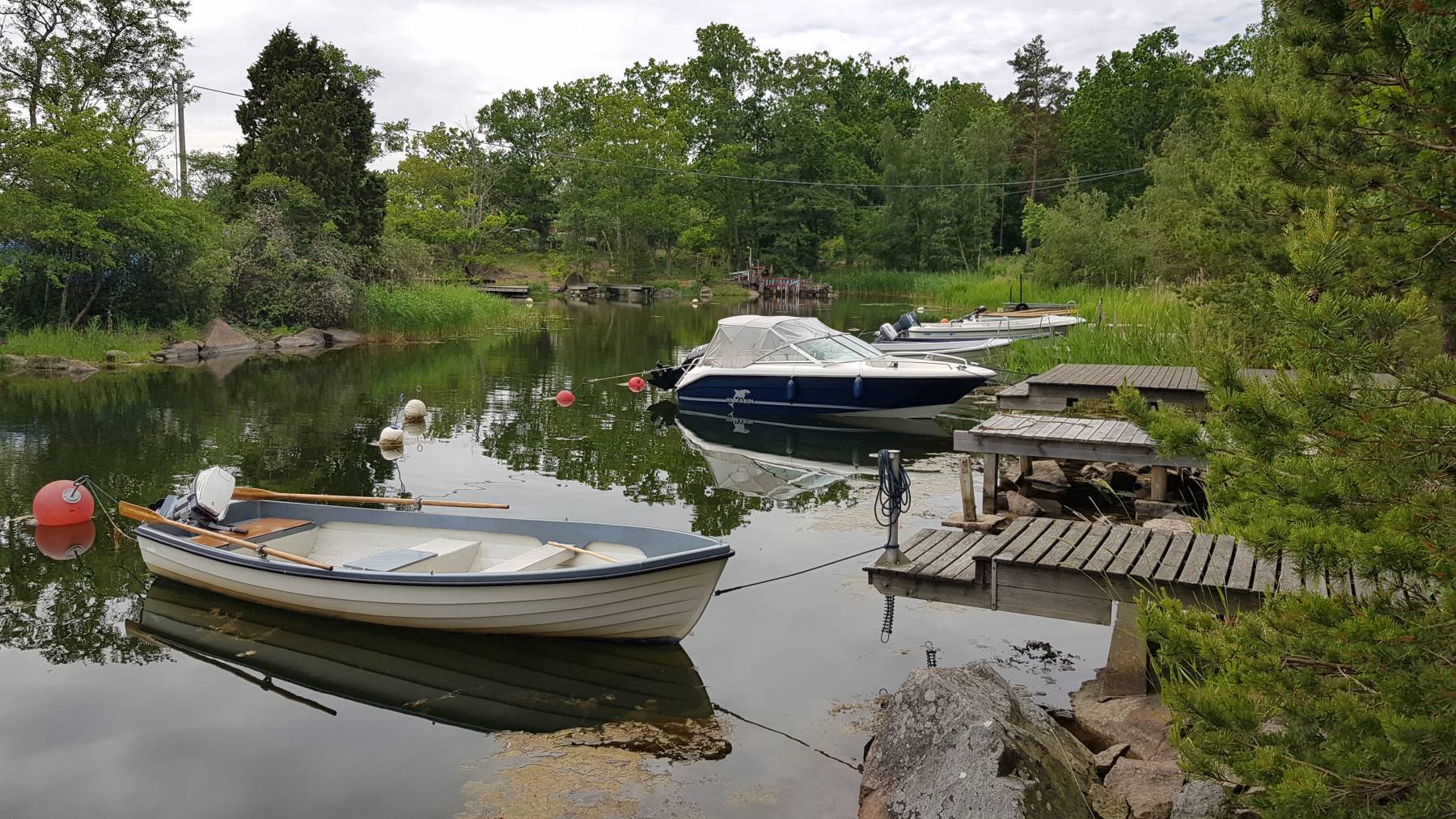 Das Thema Wäsche waschen – zum ersten Mal in Schweden – haben wir uns auch fest vorgenommen. Wie bereits erwähnt, müssen wir dafür auf einen Campingplatz. In Valdemarsvik suchen wir uns einen raus, bei dem wir auf einen Übernachtungspreis von € 20,–/Nacht kommen. Allerdings nur mit dem ACSI Rabattsystem für die Nebensaison, die hier noch bis zum 22.6. gilt. Wir fahren auf den uns zugewiesenen Platz und erfahren, dass die Waschmaschine defekt ist. Wir machen uns auf, die Shirts und Hemden mit der Hand zu waschen – „back to the roots“. Sehr ärgerlich, aber so ist es halt. Wir überlegen uns auf unserem Abendspaziergang wo wir jetzt hin sollen. Schon wieder auf einen Campingplatz oder nach Stockholm? Dort gibt es einen Waschsalon, wie wir lesen der einzige in Schweden, der Selbstwäsche ermöglicht – für € 25,– für eine 5kg Maschine bei 60 Grad. Und da sehen wir im Servicehaus im Hafen drei Waschmaschinen durch die Fenster. Man soll sich Waschzeiten im Internet buchen, steht da und erhält dann den Zugangscode oder man geht zur Touristeninfo – ist natürlich jetzt zu. Im Internet eine Waschmaschine in Valdemarsvik zu buchen gelingt uns nicht. Also am nächsten Morgen auf dem Weg uns lätschige Brötchen fürs Frühstück zu holen, noch kurz zur Touristeninfo. Und wer sagt es denn: Für knapp € 3,– können wir Waschmaschinen und Trockner den ganzen Tag lang nutzen. Der einzige Haken – das habe ich noch nicht erwähnt – das sind von unserem Stellplatz 2,4 km zu Fuß. Wir sind schon der Meinung, dass wir dafür bestraft werden müssen, dass wir den Campingplatz für zwei Tage im Voraus bezahlt haben. So packen wir, nach dem Verspeisen der wiederholt nicht leckeren Brötchen, zwei Rucksäcke und eine Tasche und marschieren bei 23 Grad los. Zum Glück ist keiner da und wir können alle drei Maschinen gleichzeitig nutzen, natürlich danach auch alle drei Trockner. Wir sind glücklich 😊.