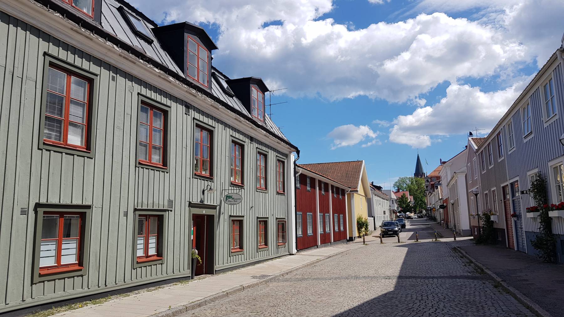 Das Thema Wäsche waschen – zum ersten Mal in Schweden – haben wir uns auch fest vorgenommen. Wie bereits erwähnt, müssen wir dafür auf einen Campingplatz. In Valdemarsvik suchen wir uns einen raus, bei dem wir auf einen Übernachtungspreis von € 20,–/Nacht kommen. Allerdings nur mit dem ACSI Rabattsystem für die Nebensaison, die hier noch bis zum 22.6. gilt. Wir fahren auf den uns zugewiesenen Platz und erfahren, dass die Waschmaschine defekt ist. Wir machen uns auf, die Shirts und Hemden mit der Hand zu waschen – „back to the roots“. Sehr ärgerlich, aber so ist es halt. Wir überlegen uns auf unserem Abendspaziergang wo wir jetzt hin sollen. Schon wieder auf einen Campingplatz oder nach Stockholm? Dort gibt es einen Waschsalon, wie wir lesen der einzige in Schweden, der Selbstwäsche ermöglicht – für € 25,– für eine 5kg Maschine bei 60 Grad. Und da sehen wir im Servicehaus im Hafen drei Waschmaschinen durch die Fenster. Man soll sich Waschzeiten im Internet buchen, steht da und erhält dann den Zugangscode oder man geht zur Touristeninfo – ist natürlich jetzt zu. Im Internet eine Waschmaschine in Valdemarsvik zu buchen gelingt uns nicht. Also am nächsten Morgen auf dem Weg uns lätschige Brötchen fürs Frühstück zu holen, noch kurz zur Touristeninfo. Und wer sagt es denn: Für knapp € 3,– können wir Waschmaschinen und Trockner den ganzen Tag lang nutzen. Der einzige Haken – das habe ich noch nicht erwähnt – das sind von unserem Stellplatz 2,4 km zu Fuß. Wir sind schon der Meinung, dass wir dafür bestraft werden müssen, dass wir den Campingplatz für zwei Tage im Voraus bezahlt haben. So packen wir, nach dem Verspeisen der wiederholt nicht leckeren Brötchen, zwei Rucksäcke und eine Tasche und marschieren bei 23 Grad los. Zum Glück ist keiner da und wir können alle drei Maschinen gleichzeitig nutzen, natürlich danach auch alle drei Trockner. Wir sind glücklich 😊.