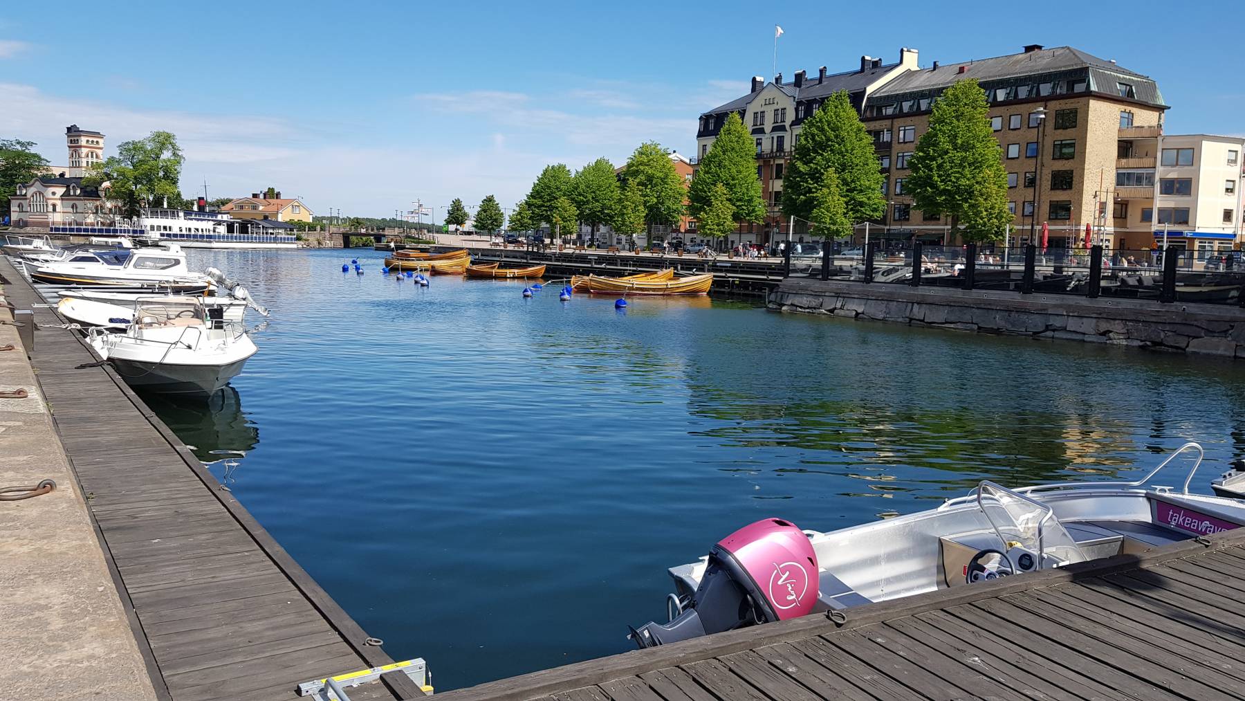 Das Thema Wäsche waschen – zum ersten Mal in Schweden – haben wir uns auch fest vorgenommen. Wie bereits erwähnt, müssen wir dafür auf einen Campingplatz. In Valdemarsvik suchen wir uns einen raus, bei dem wir auf einen Übernachtungspreis von € 20,–/Nacht kommen. Allerdings nur mit dem ACSI Rabattsystem für die Nebensaison, die hier noch bis zum 22.6. gilt. Wir fahren auf den uns zugewiesenen Platz und erfahren, dass die Waschmaschine defekt ist. Wir machen uns auf, die Shirts und Hemden mit der Hand zu waschen – „back to the roots“. Sehr ärgerlich, aber so ist es halt. Wir überlegen uns auf unserem Abendspaziergang wo wir jetzt hin sollen. Schon wieder auf einen Campingplatz oder nach Stockholm? Dort gibt es einen Waschsalon, wie wir lesen der einzige in Schweden, der Selbstwäsche ermöglicht – für € 25,– für eine 5kg Maschine bei 60 Grad. Und da sehen wir im Servicehaus im Hafen drei Waschmaschinen durch die Fenster. Man soll sich Waschzeiten im Internet buchen, steht da und erhält dann den Zugangscode oder man geht zur Touristeninfo – ist natürlich jetzt zu. Im Internet eine Waschmaschine in Valdemarsvik zu buchen gelingt uns nicht. Also am nächsten Morgen auf dem Weg uns lätschige Brötchen fürs Frühstück zu holen, noch kurz zur Touristeninfo. Und wer sagt es denn: Für knapp € 3,– können wir Waschmaschinen und Trockner den ganzen Tag lang nutzen. Der einzige Haken – das habe ich noch nicht erwähnt – das sind von unserem Stellplatz 2,4 km zu Fuß. Wir sind schon der Meinung, dass wir dafür bestraft werden müssen, dass wir den Campingplatz für zwei Tage im Voraus bezahlt haben. So packen wir, nach dem Verspeisen der wiederholt nicht leckeren Brötchen, zwei Rucksäcke und eine Tasche und marschieren bei 23 Grad los. Zum Glück ist keiner da und wir können alle drei Maschinen gleichzeitig nutzen, natürlich danach auch alle drei Trockner. Wir sind glücklich 😊.