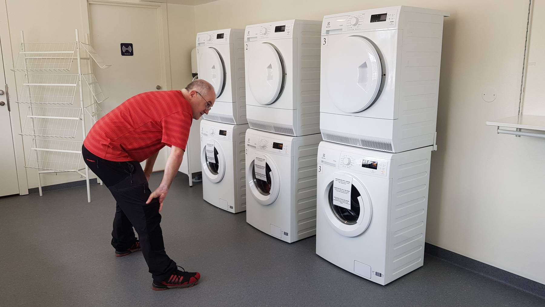 Das Thema Wäsche waschen – zum ersten Mal in Schweden – haben wir uns auch fest vorgenommen. Wie bereits erwähnt, müssen wir dafür auf einen Campingplatz. In Valdemarsvik suchen wir uns einen raus, bei dem wir auf einen Übernachtungspreis von € 20,–/Nacht kommen. Allerdings nur mit dem ACSI Rabattsystem für die Nebensaison, die hier noch bis zum 22.6. gilt. Wir fahren auf den uns zugewiesenen Platz und erfahren, dass die Waschmaschine defekt ist. Wir machen uns auf, die Shirts und Hemden mit der Hand zu waschen – „back to the roots“. Sehr ärgerlich, aber so ist es halt. Wir überlegen uns auf unserem Abendspaziergang wo wir jetzt hin sollen. Schon wieder auf einen Campingplatz oder nach Stockholm? Dort gibt es einen Waschsalon, wie wir lesen der einzige in Schweden, der Selbstwäsche ermöglicht – für € 25,– für eine 5kg Maschine bei 60 Grad. Und da sehen wir im Servicehaus im Hafen drei Waschmaschinen durch die Fenster. Man soll sich Waschzeiten im Internet buchen, steht da und erhält dann den Zugangscode oder man geht zur Touristeninfo – ist natürlich jetzt zu. Im Internet eine Waschmaschine in Valdemarsvik zu buchen gelingt uns nicht. Also am nächsten Morgen auf dem Weg uns lätschige Brötchen fürs Frühstück zu holen, noch kurz zur Touristeninfo. Und wer sagt es denn: Für knapp € 3,– können wir Waschmaschinen und Trockner den ganzen Tag lang nutzen. Der einzige Haken – das habe ich noch nicht erwähnt – das sind von unserem Stellplatz 2,4 km zu Fuß. Wir sind schon der Meinung, dass wir dafür bestraft werden müssen, dass wir den Campingplatz für zwei Tage im Voraus bezahlt haben. So packen wir, nach dem Verspeisen der wiederholt nicht leckeren Brötchen, zwei Rucksäcke und eine Tasche und marschieren bei 23 Grad los. Zum Glück ist keiner da und wir können alle drei Maschinen gleichzeitig nutzen, natürlich danach auch alle drei Trockner. Wir sind glücklich 😊.