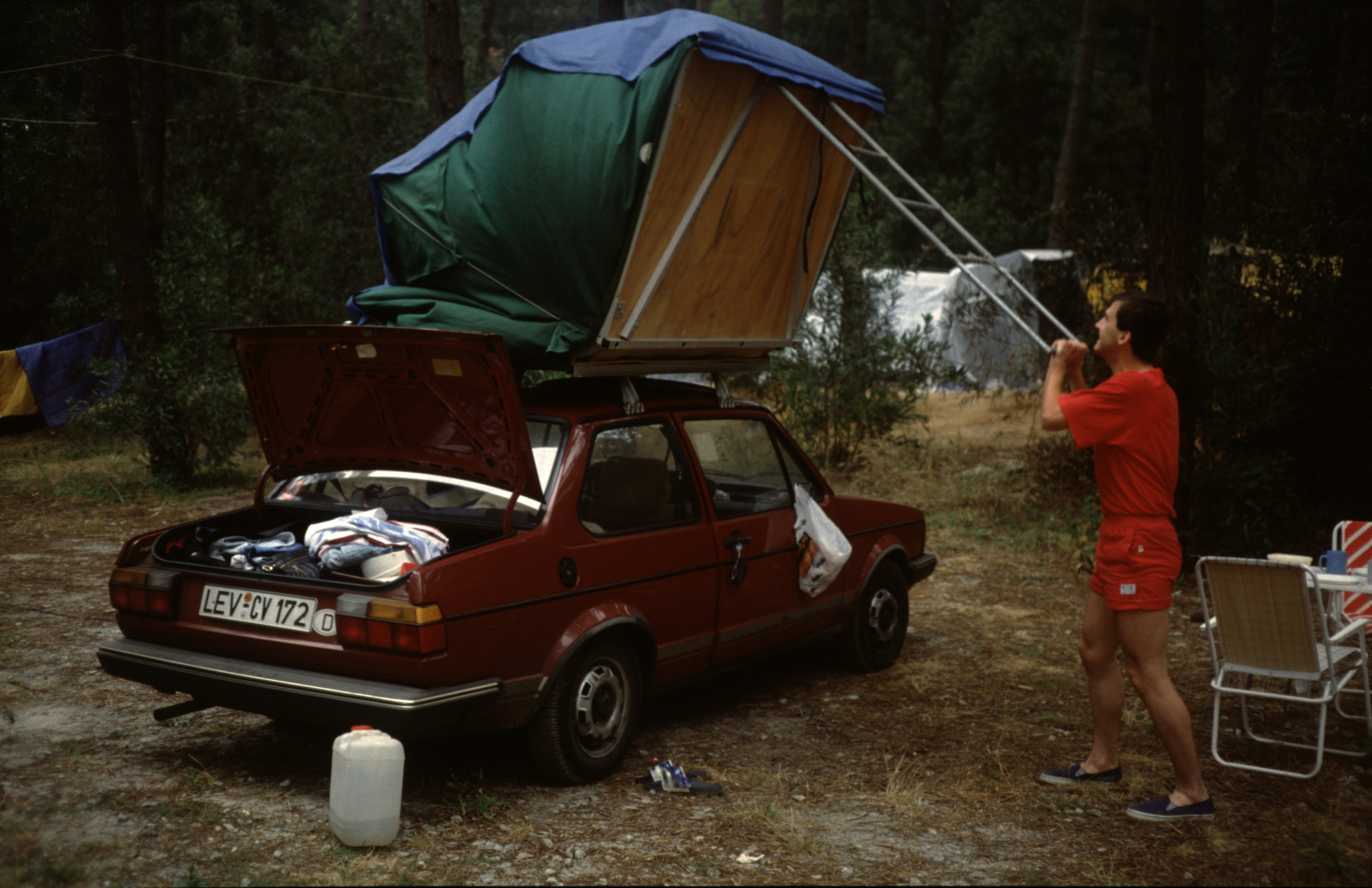 Der Jetta war mein zweites Auto. Er war jünger und hatte unter anderem eine Dachreling gegenüber Anettes Opel Kadett. Die Reling war maßgeblich für die Befestigung des Dachzeltes. In diesem habe ich bereits in den siebzigern als Kind geschlafen. Das Dachzelt war zwar in die Jahre gekommen, aber sehr praktisch, wenn man wie Anette keine Lust mehr auf Zelten hat bzw. keine Lust mehr auf dem Boden zu schlafen. Einfach aufzubauen und gefühlt sicher vor Krabbelzeug.