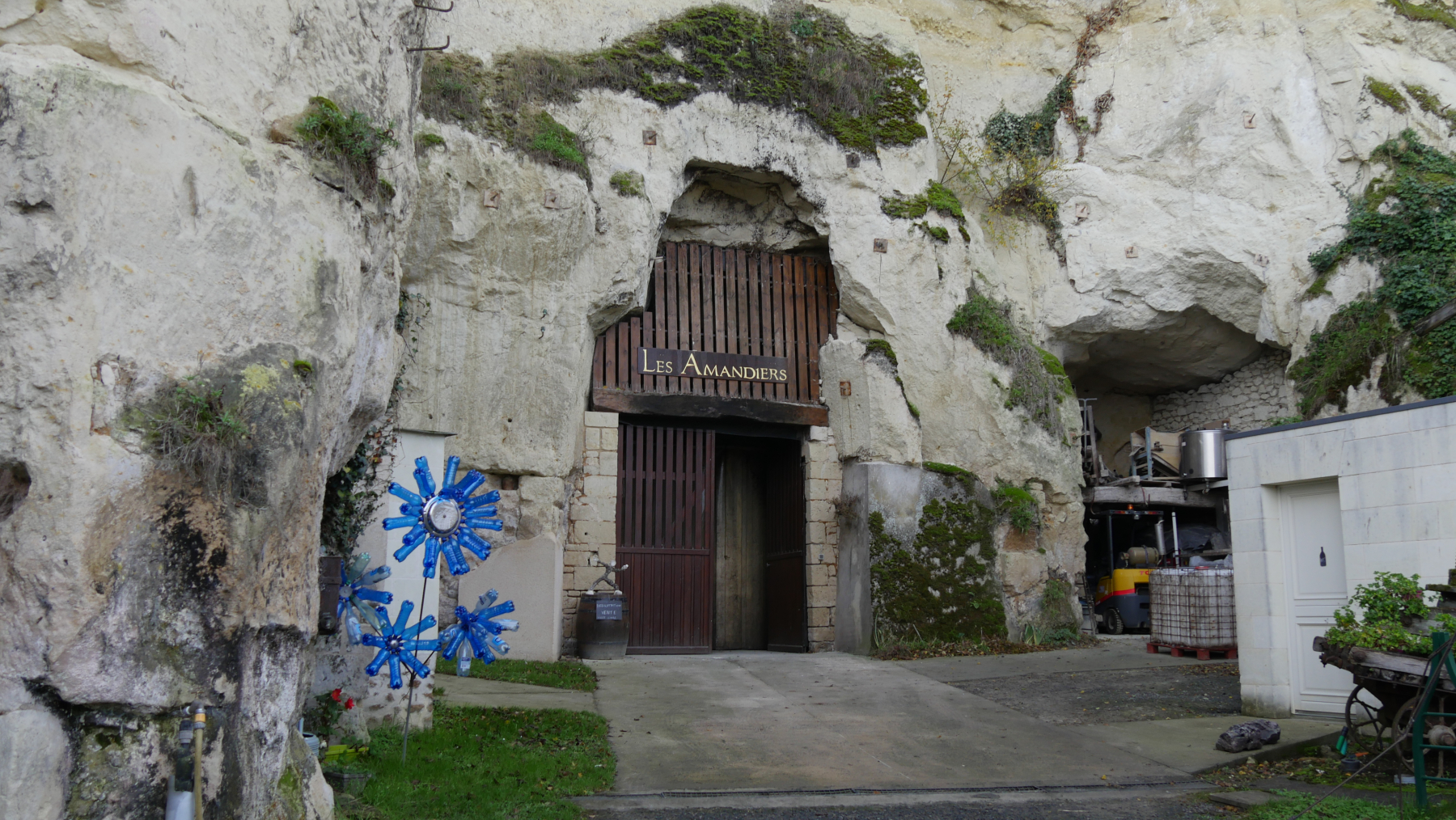 Ein weiterer, richtiger Höhlenwohnort ist das Dorf Orbière, dessen erste Siedlungsspuren bis ins Mittelalter zurückreichen und in dem noch zu Beginn des letzten Jahrhunderts mehrere Familien lebten. In den 70er Jahren übernahm Jacques Warminski , ein in Polen geborener Künstler aus Angers, die damals verlassenen Räumlichkeiten, um in nur fünf Jahren, von 1988 bis 1993, ein monumentales Kunstwerk, die Terrestrial Helix, zu schaffen. Wir haben Glück, keiner da und alles offen.