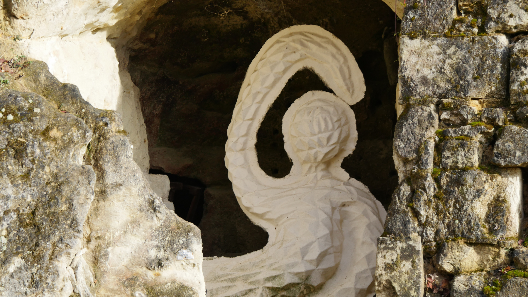 Ein weiterer, richtiger Höhlenwohnort ist das Dorf Orbière, dessen erste Siedlungsspuren bis ins Mittelalter zurückreichen und in dem noch zu Beginn des letzten Jahrhunderts mehrere Familien lebten. In den 70er Jahren übernahm Jacques Warminski , ein in Polen geborener Künstler aus Angers, die damals verlassenen Räumlichkeiten, um in nur fünf Jahren, von 1988 bis 1993, ein monumentales Kunstwerk, die Terrestrial Helix, zu schaffen. Wir haben Glück, keiner da und alles offen.