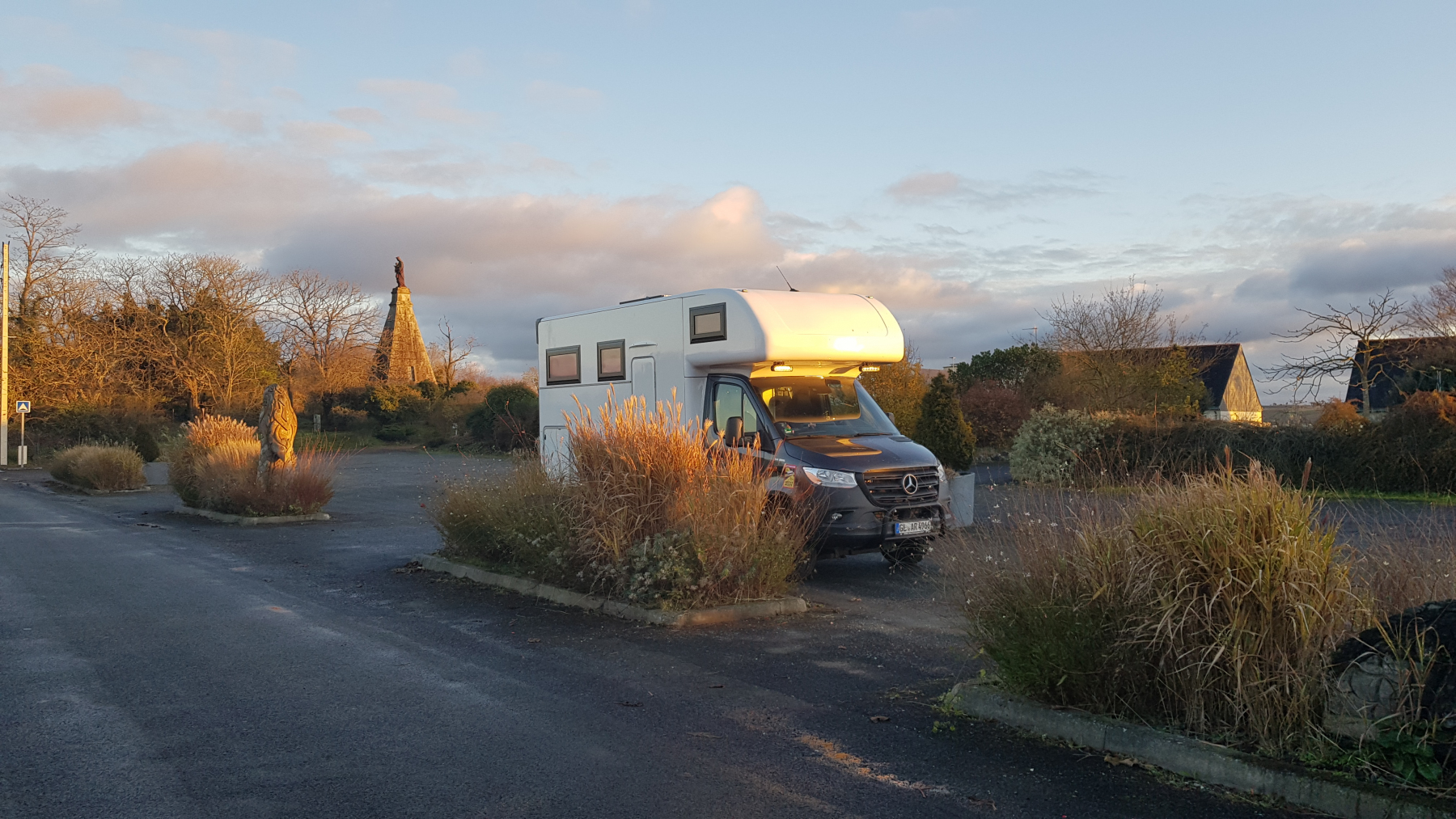 Am Morgen des 1. Dezember 2021 will ich per Knopfdruck den Motor starten. Er startet – das komplette Cockpit bleibt aber dunkel. Ich fasse hier nur kurz alle unsere Tests als vergeblich zusammen. Wir wissen halt nicht was noch alles nicht funktioniert, ist ja ein sehr technisches Fahrzeug. Also rufen wir die Hotline an, die im Türrahmen vermerkt ist. Eine nette deutsche Stimme verspricht uns einen Techniker. Auf den warten wir bis abends vergeblich und besuchen währenddessen die benachbarte Kirche.