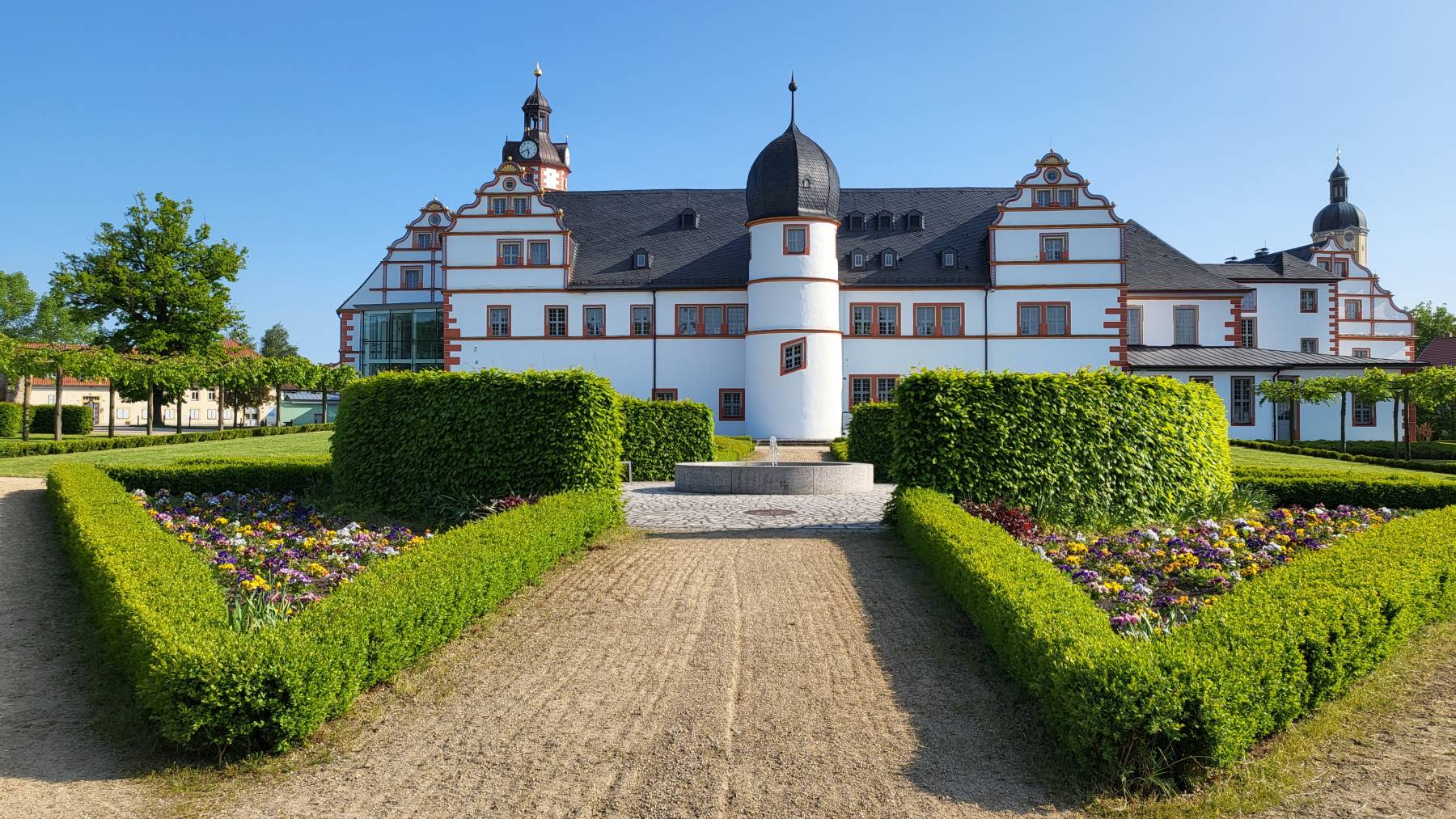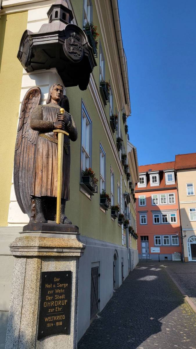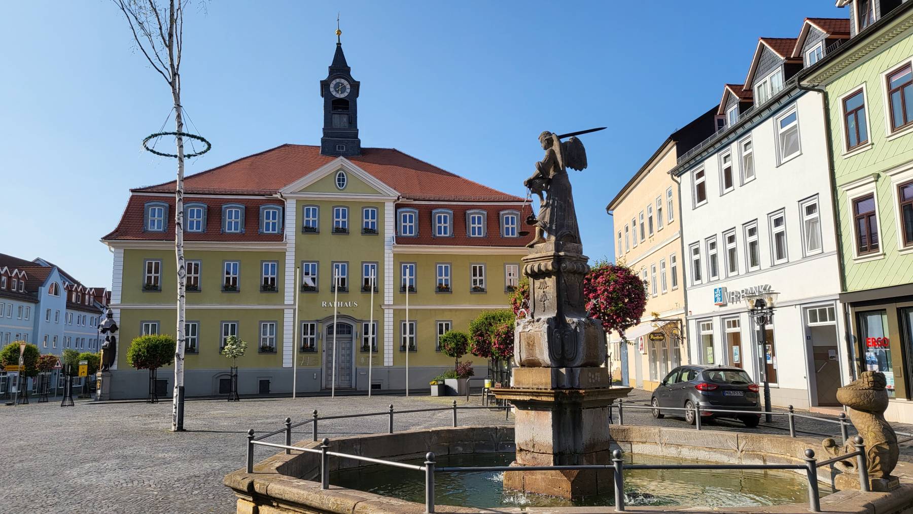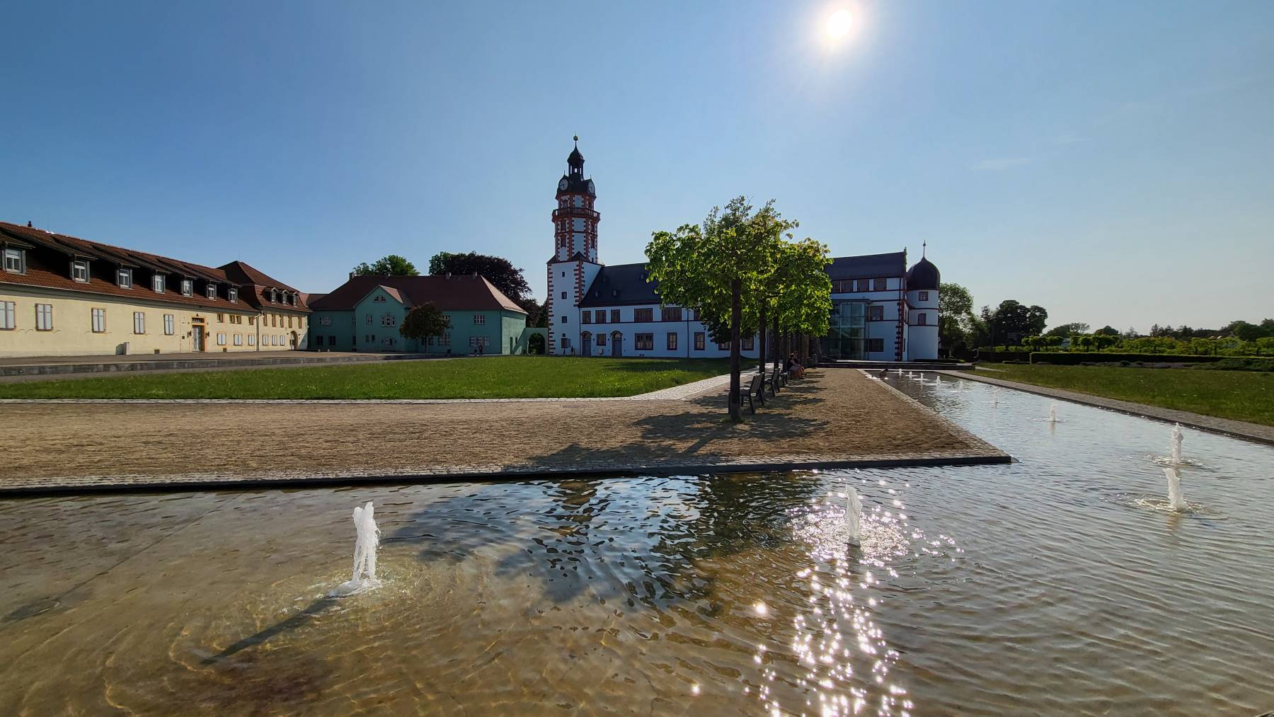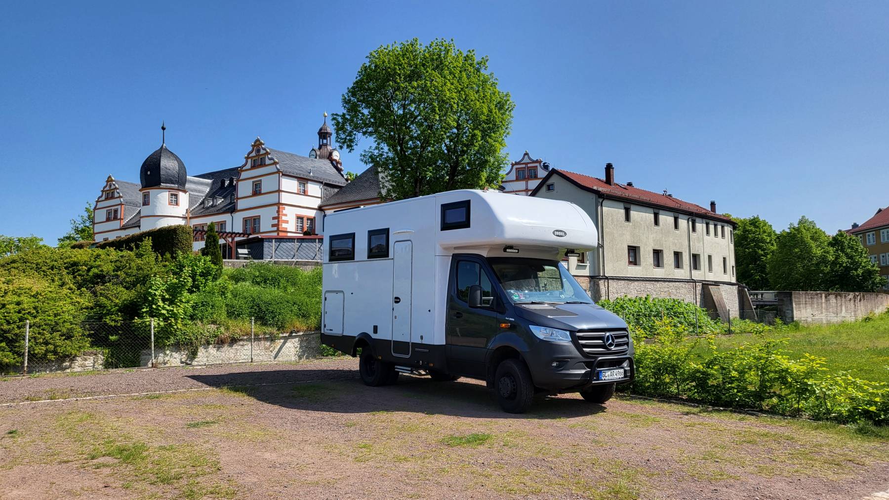 Wir fahren aber nicht mehr lange Stecken, also nicht einfach durch. So suchen wir ca. auf halber Strecke einen Stellplatz, abseits der Autobahn, möglichst in einem netten kleinen Dorf. Die Wahl fällt auf Ohrdruf mit dem Schloss Ehrenstein – vorher noch nie gehört. Ein kostenloser Stellplatz mit Blick auf ein renoviertes Schloß und direkt im größtenteils sehr schön renovierten Ort – ein guter Start.