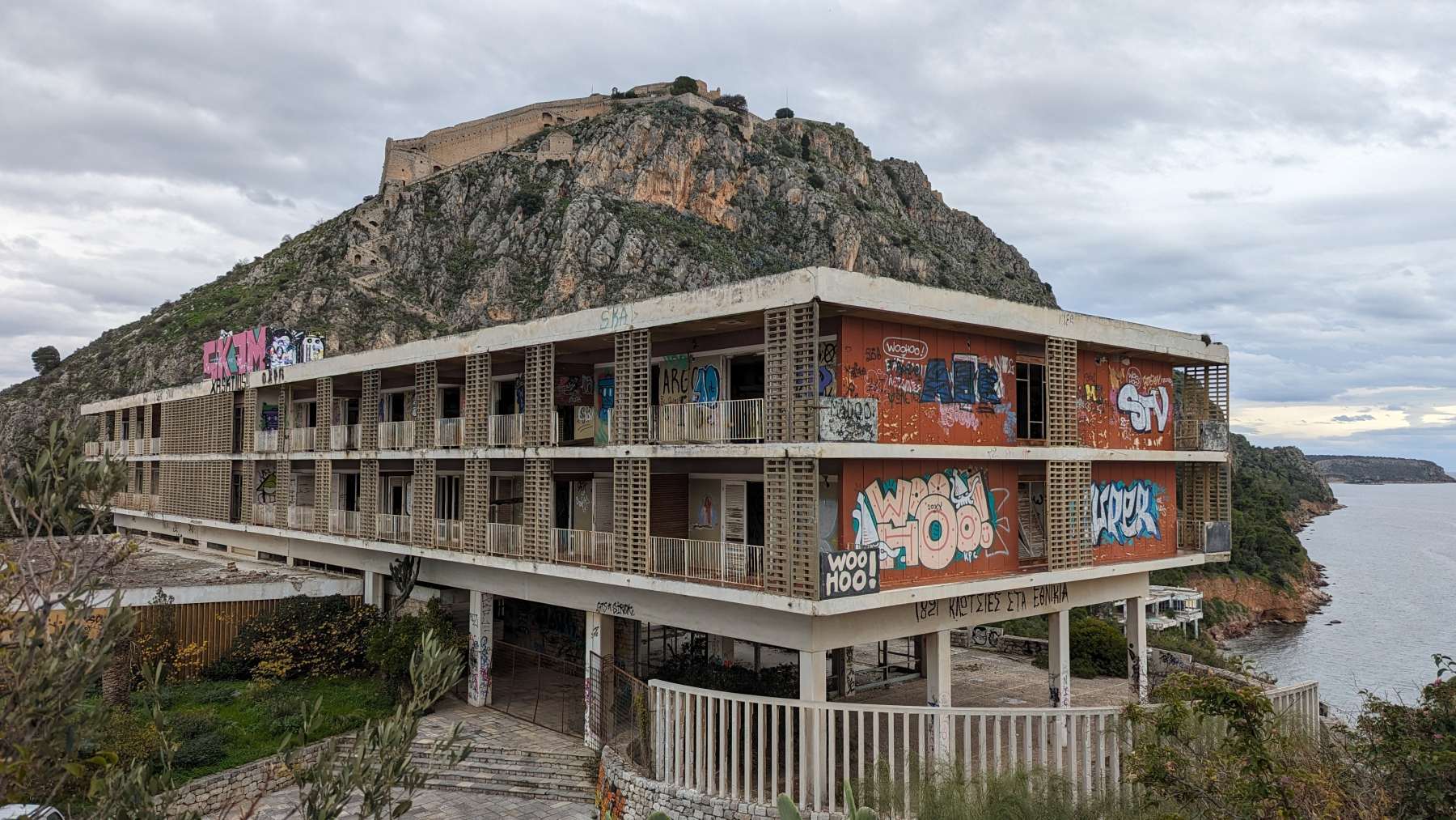 Das ehemalige Luxus-Hotel auf der Halbinsel Peloponnes im Süden Griechenlands wurde in den 1970ern erbaut. Es verfügte über 600 Betten, Bungalows, Sportanlagen, eine Strand-Disco und ein Amphitheater.