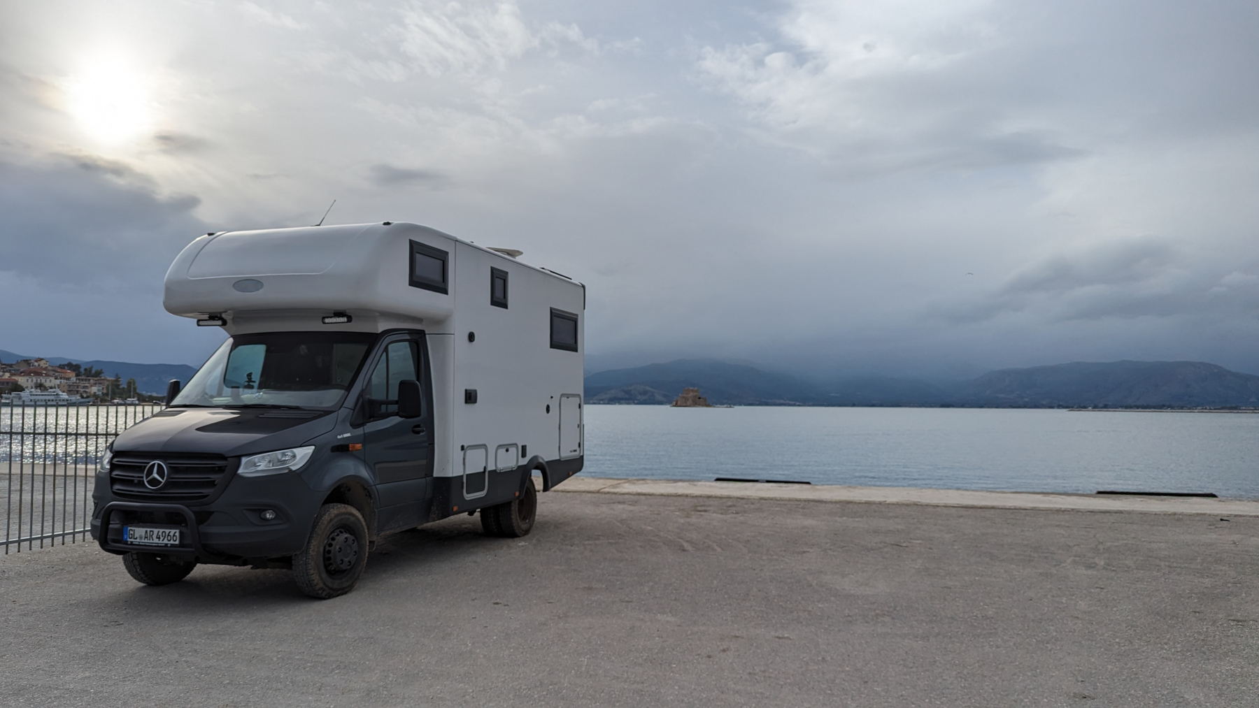 Nach einem Abstecher zu den Dolinen von Didima geht es nach Nafplion. Wir wollen am Montag endlich ein neues Reserverad. Im Hafen staunen wir nicht schlecht. Über 40 Wohnmobile, teilweise zwischen LKW, stehen auf dem sehr weitläufigen Gelände verteilt. Wir stellen uns abseits mit einigen anderen auf die nicht betonierte Fläche.