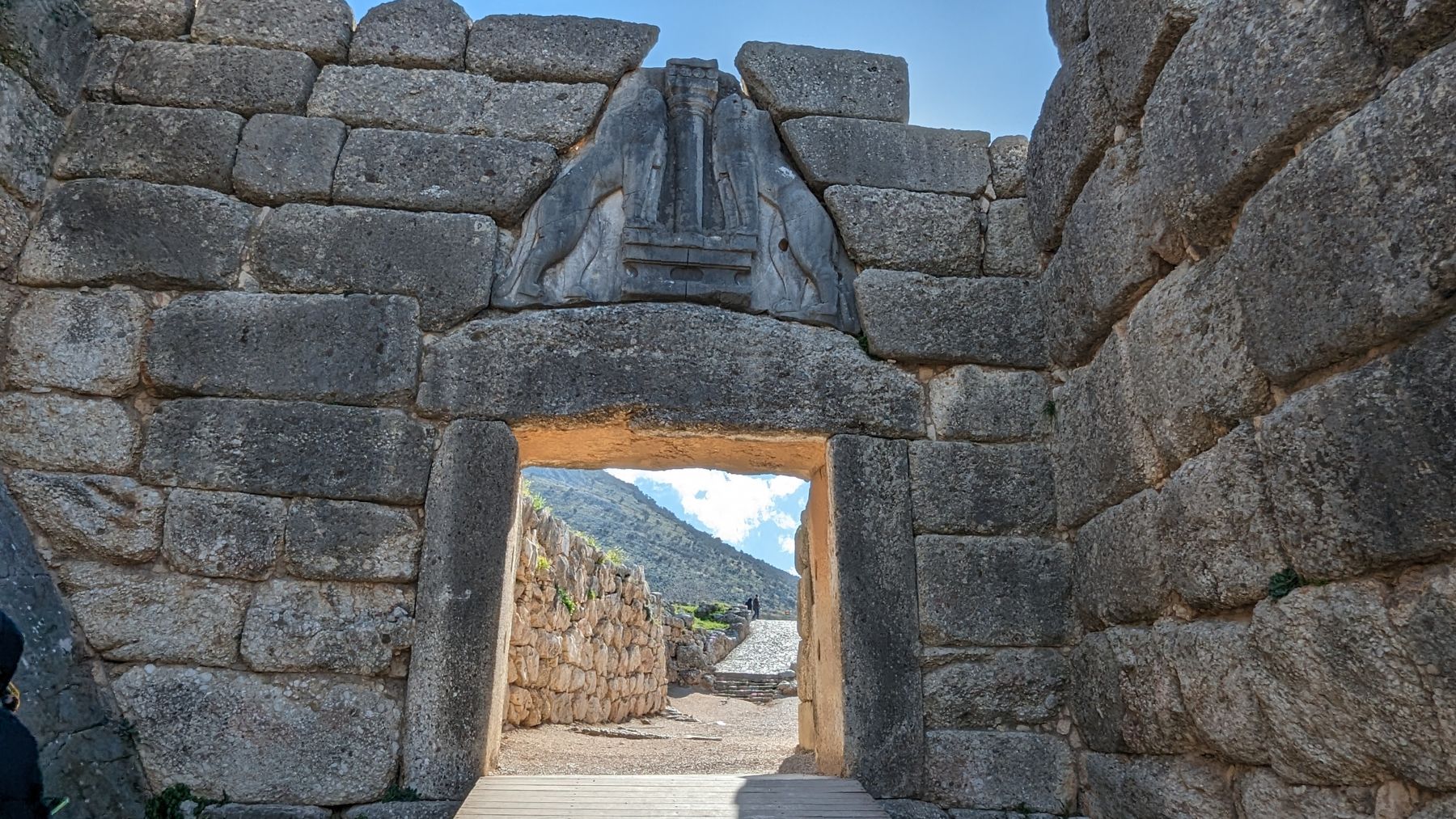 Der Sonntag ist mal wieder sehr stürmisch, bzw. häufig starke Böen. Nur 1,4 km von der antiken Ausgrabung Mykene entfernt verlassen das Auto gar nicht. Auch wenn wir diese Stätte mit dem berühmten Löwentor schon mal besucht haben, müssen wir sie jetzt doch noch einmal beehren. € 6,– Eintritt, mehrere Reisebusse mit Schülern und asiatischen Touristen und ein sehr sehenswertes neues – aus 2003 – Museum sind die ersten Eindrücke. Das Löwentor steht noch wie ich es aus den 70ern in Erinnerung hatte. Die Kuppelgräber sind aber auch sehr beeindruckend. Es hat sich gelohnt.