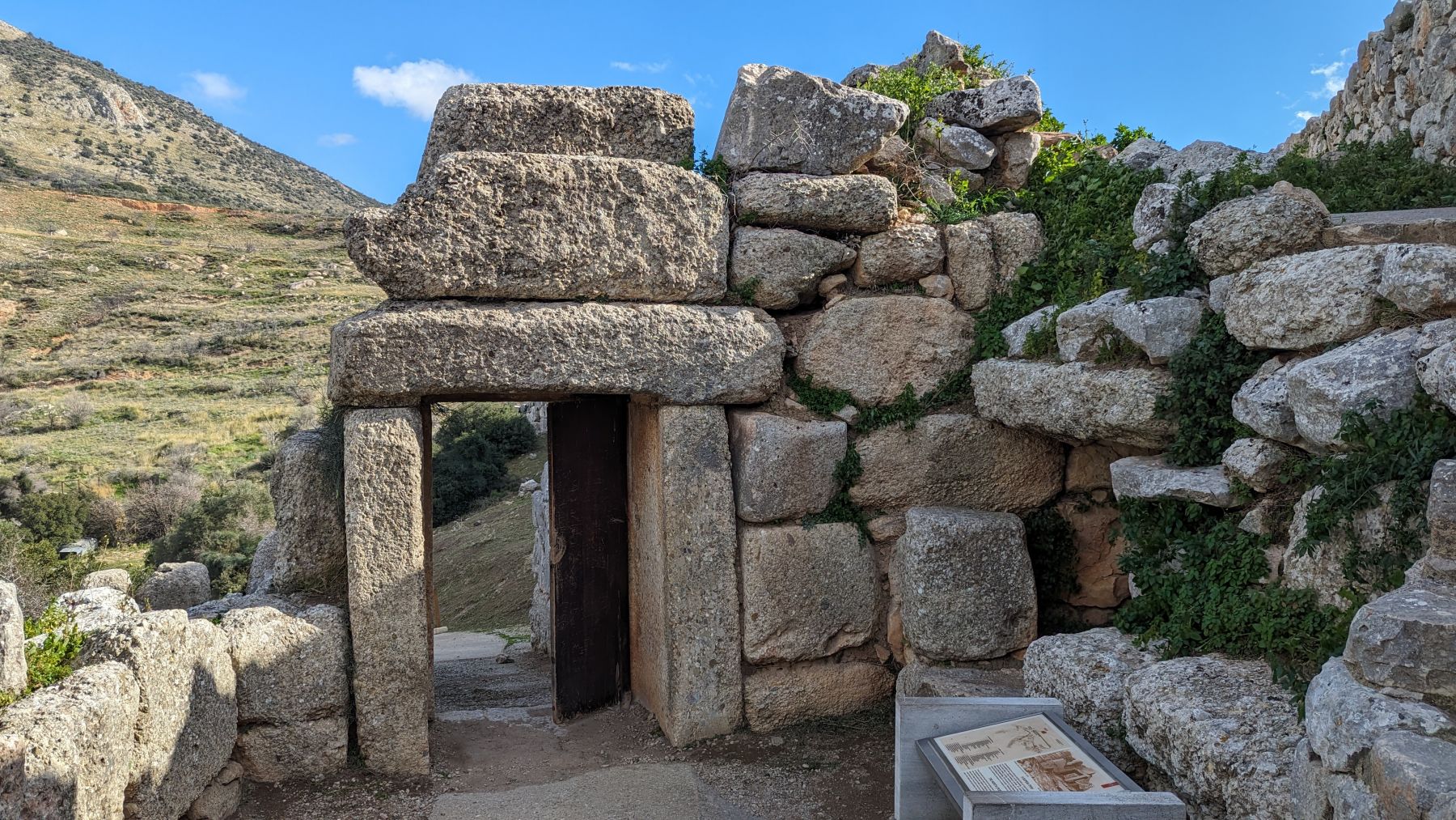 Der Sonntag ist mal wieder sehr stürmisch, bzw. häufig starke Böen. Nur 1,4 km von der antiken Ausgrabung Mykene entfernt verlassen das Auto gar nicht. Auch wenn wir diese Stätte mit dem berühmten Löwentor schon mal besucht haben, müssen wir sie jetzt doch noch einmal beehren. € 6,– Eintritt, mehrere Reisebusse mit Schülern und asiatischen Touristen und ein sehr sehenswertes neues – aus 2003 – Museum sind die ersten Eindrücke. Das Löwentor steht noch wie ich es aus den 70ern in Erinnerung hatte. Die Kuppelgräber sind aber auch sehr beeindruckend. Es hat sich gelohnt.