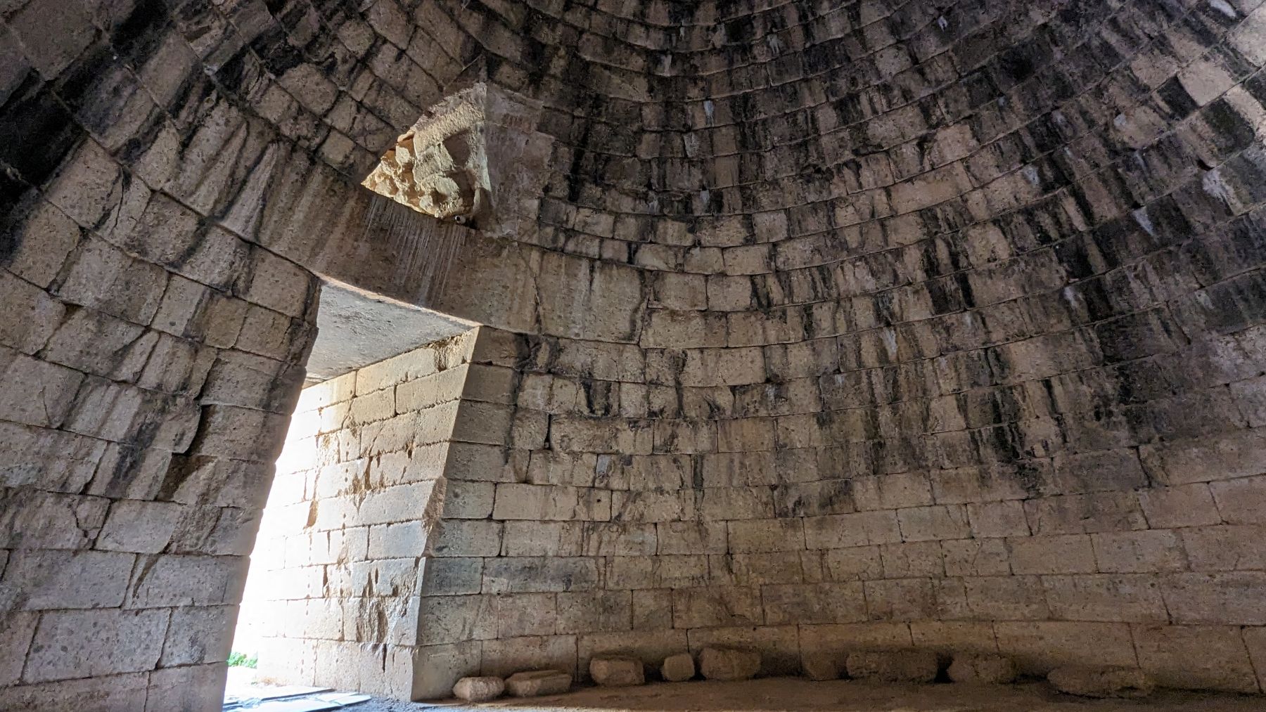 Der Sonntag ist mal wieder sehr stürmisch, bzw. häufig starke Böen. Nur 1,4 km von der antiken Ausgrabung Mykene entfernt verlassen das Auto gar nicht. Auch wenn wir diese Stätte mit dem berühmten Löwentor schon mal besucht haben, müssen wir sie jetzt doch noch einmal beehren. € 6,– Eintritt, mehrere Reisebusse mit Schülern und asiatischen Touristen und ein sehr sehenswertes neues – aus 2003 – Museum sind die ersten Eindrücke. Das Löwentor steht noch wie ich es aus den 70ern in Erinnerung hatte. Die Kuppelgräber sind aber auch sehr beeindruckend. Es hat sich gelohnt.
