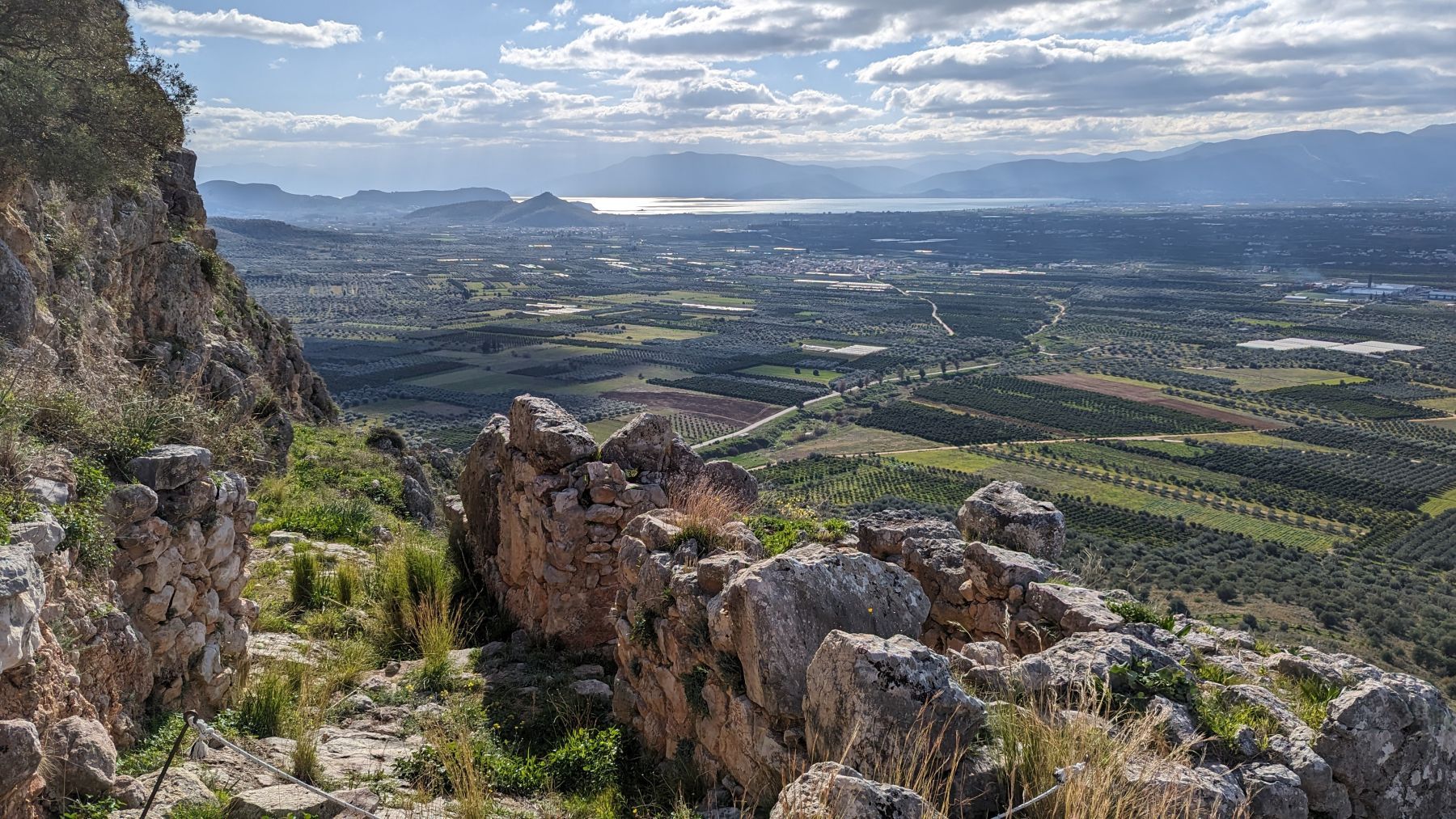 Nur wenige Kilometer und wir stehen wieder bei schönstem Sonnenschein in Nafplion im Hafen. So einfach ist das bei uns aber nicht. Ein braunes Schild weist zum antiken Tempel „Heraion von Argos“, ein weiteres dann zur „Akropolis der antiken Midea“. Beides mühsam zu erreichen und kostenlos. Bei letzterem werden wir freudig vom Wachmann empfangen. Er fragt, ob wir uns verfahren haben und nach Mykene wollten. Nachdem wir verneint haben, erklärte er uns die mühsam zu erklimmende Ausgrabung mit einem modernen Prospekt. Beides lohnt nicht wirklich, für archäologisch Interessierte aber sehenswert und sehr schön gelegen.