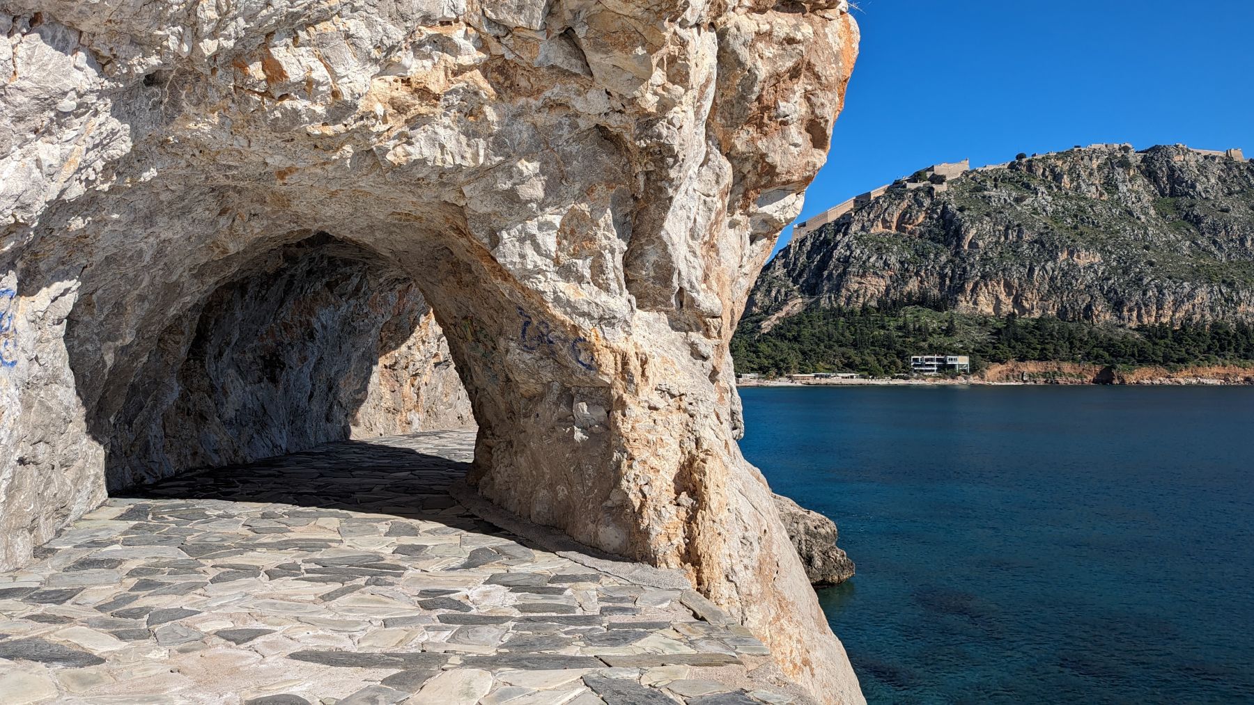 In Nafplion stehen wieder so um die 20 Wohnmobile. Dieses Mal strahlt aber die Sonne und es sind 18 Grad. Am Donnerstag können wir endlich das Paket abholen und fahren direkt weiter südlich Richtung Monemvasia. Wir halten in Plaka, wo man früher sehr schön am Strand wild stehen konnte – heute verboten. Bei einem kleinen Spaziergang treffen wir auf eine Menge Vans mit Aussteigern aus Österreich, Frankreich und Berlin. Kein Ort mehr für uns, auf den kleinen Campingplatz haben wir keine Lust bzw. keinen Bedarf.
