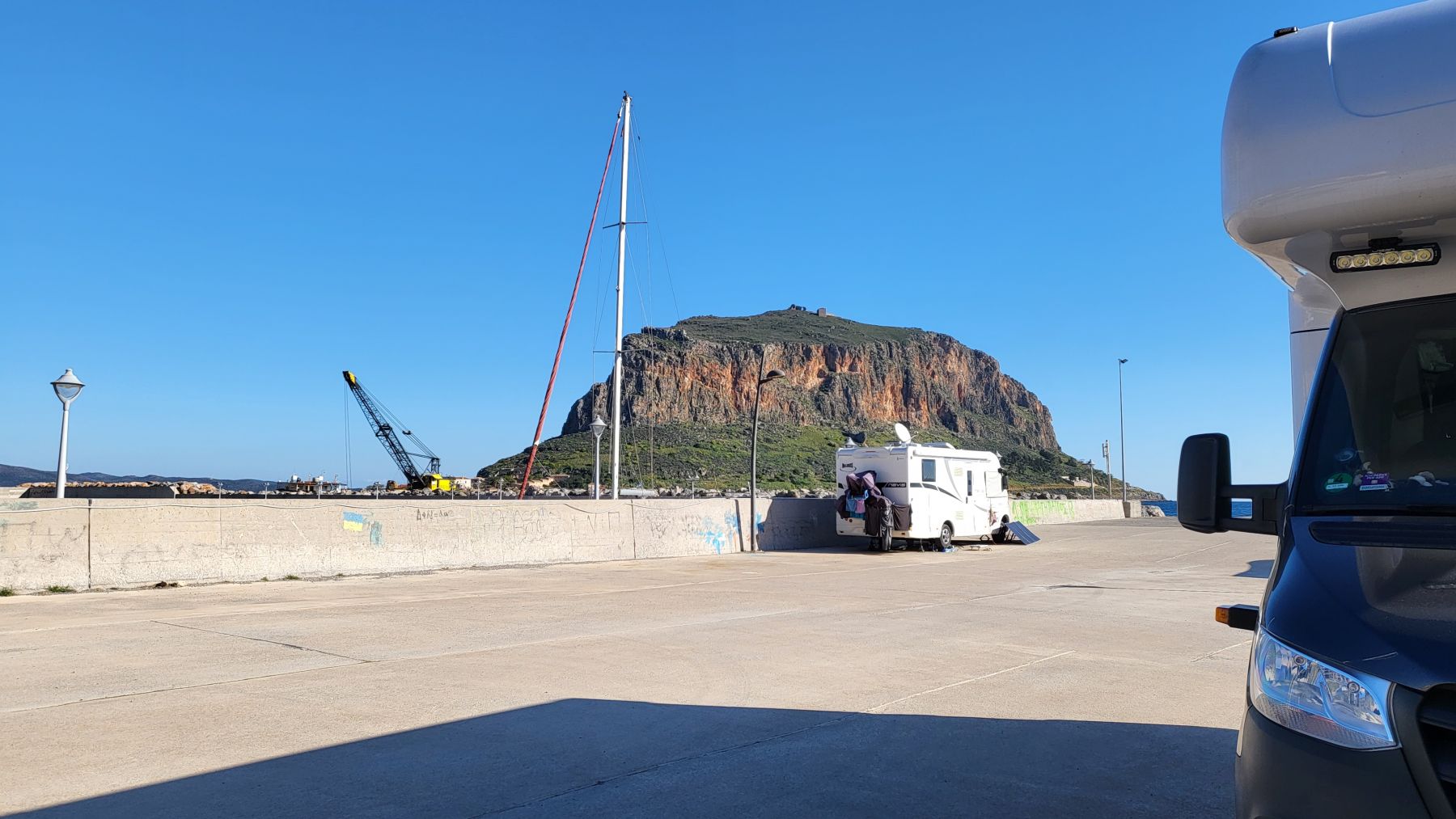 Der Stellplatz ist nicht unbedingt schlecht, mit Sicht auf die fotogene Felseninsel. Es fahren aber durchgängig Fischer an das Ende des Kais, Poser kommen. Miauende Katzen, bellende Hunde und sich fest eingerichtete Franzosen führen dann dazu, dass wir uns nicht wohl fühlen.