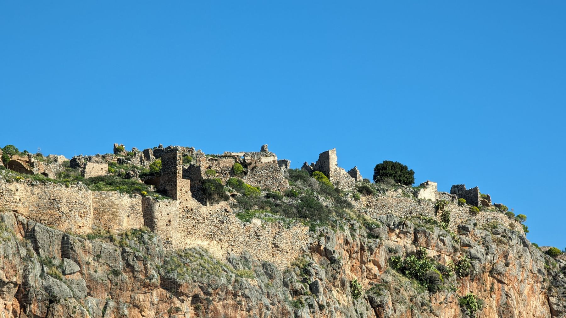Also weiter bis Monemvasia, einer kleinen Insel mit Festung und mittelalterlicher Stadt, nur mit einem schmalen Damm mit dem Festland verbunden. Unter blauem Himmel erkunden wir die im Winter kaum bewohnte und wenig besuchte kleine Stadt – sehr sehenswert. Statt ganz zu Fuß hoch zur Festung, starten wir die Drohne.