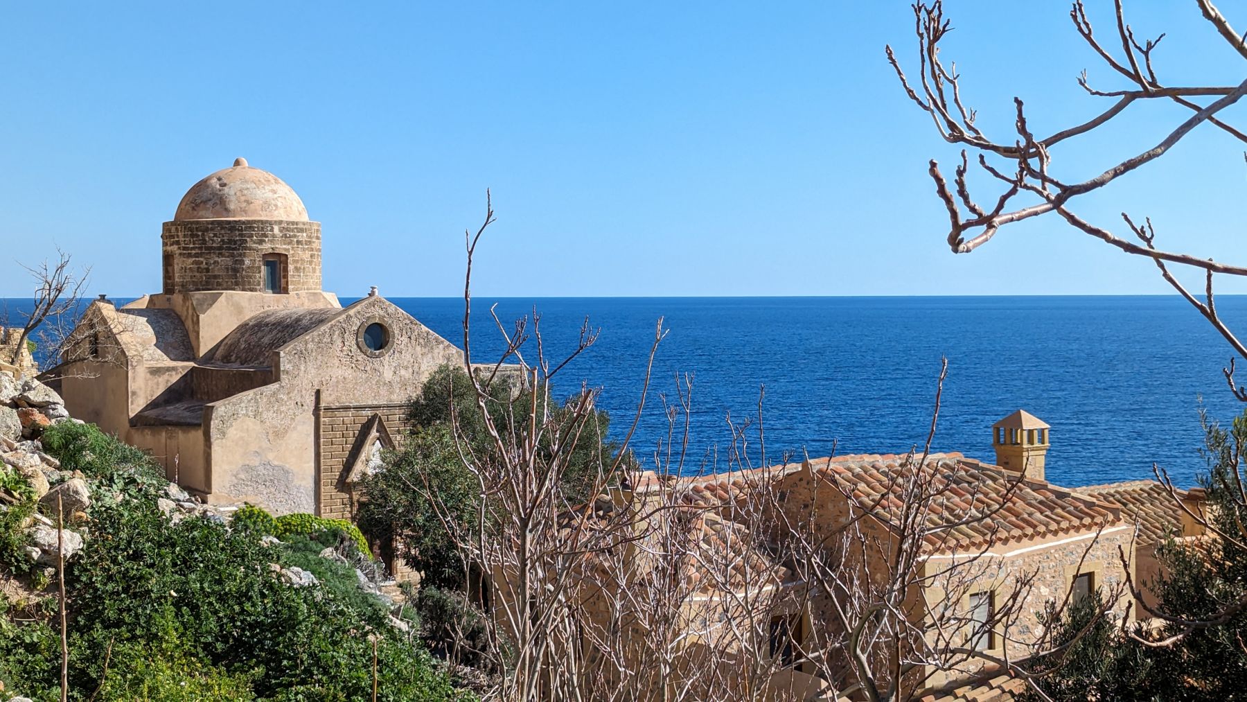 Also weiter bis Monemvasia, einer kleinen Insel mit Festung und mittelalterlicher Stadt, nur mit einem schmalen Damm mit dem Festland verbunden. Unter blauem Himmel erkunden wir die im Winter kaum bewohnte und wenig besuchte kleine Stadt – sehr sehenswert. Statt ganz zu Fuß hoch zur Festung, starten wir die Drohne.