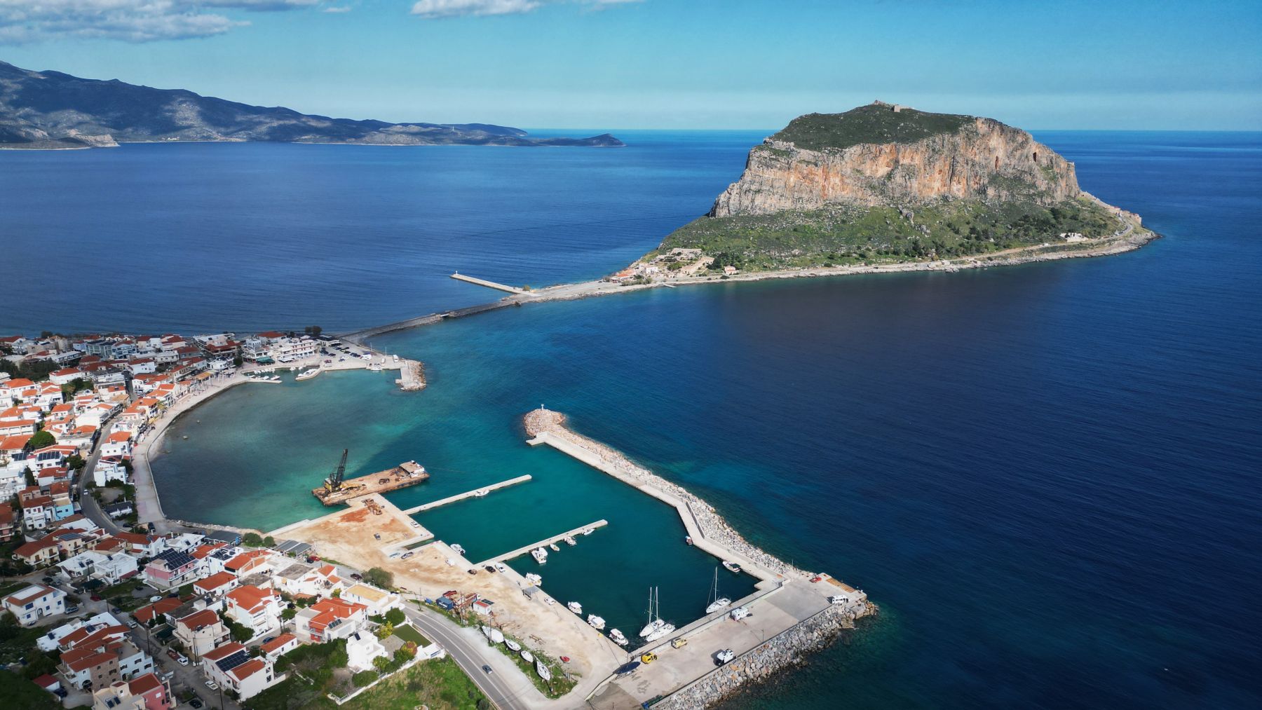 Also weiter bis Monemvasia, einer kleinen Insel mit Festung und mittelalterlicher Stadt, nur mit einem schmalen Damm mit dem Festland verbunden. Unter blauem Himmel erkunden wir die im Winter kaum bewohnte und wenig besuchte kleine Stadt – sehr sehenswert. Statt ganz zu Fuß hoch zur Festung, starten wir die Drohne.
