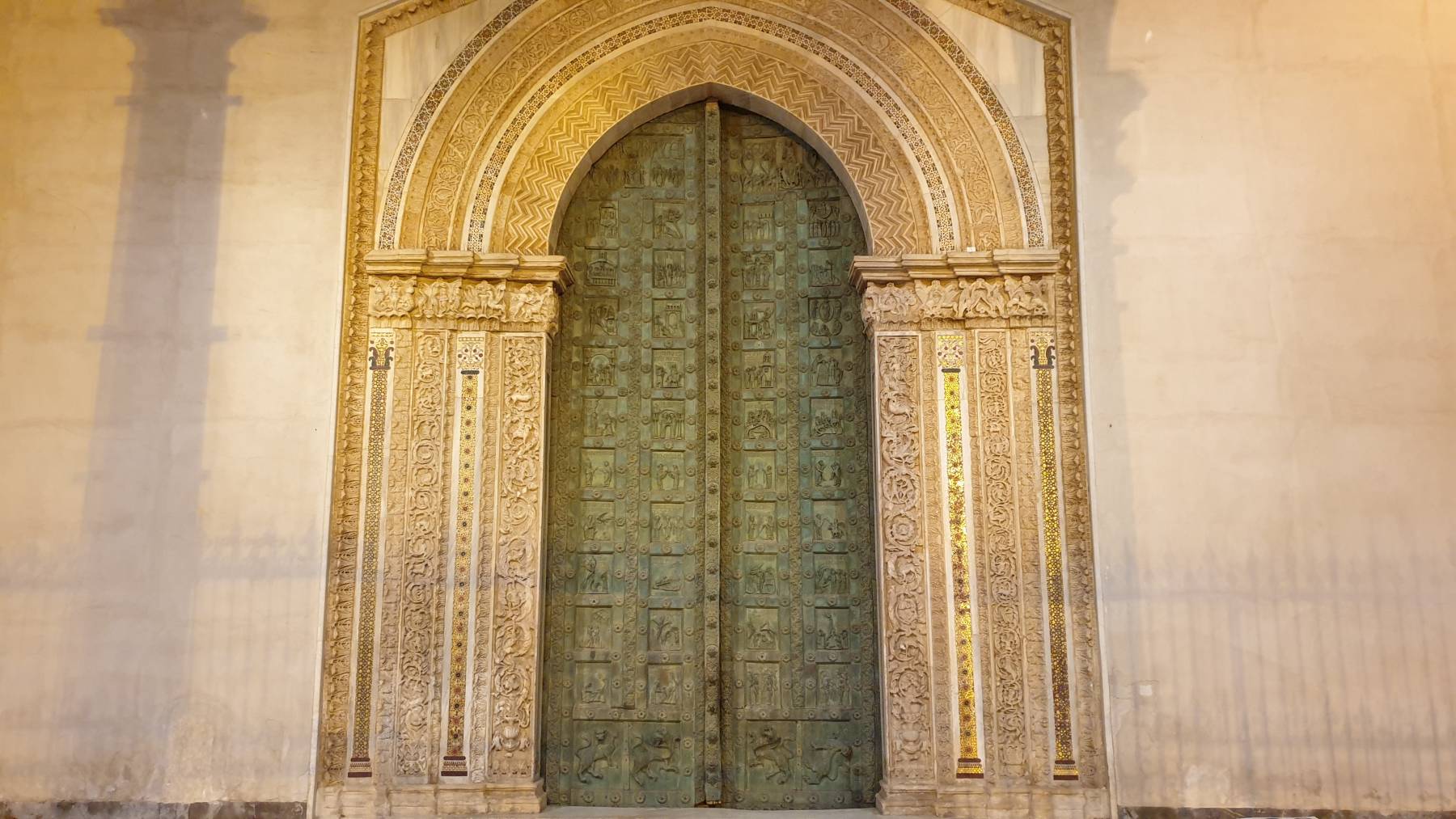 Monreale, mit einem besonderen Kirchenbau, haben wir uns als kleinen Zwischenstopp vorgenommen. Als wir ankommen wird es gerade dunkel und sehr stürmisch. Wir bleiben auf dem Parkplatz unterhalb der Kathedrale mit Blick auf Palermo. Wohnmobile zahlen € 3,–/Stunde, allerdings von 20 bis 8 Uhr morgens kostenlos. So handeln wir um 17:10 Uhr einen Preis von € 14,– bis 10 Uhr morgens aus. Der Deal wird zeitgemäß auf einem Stück Papier handschriftlich von dem Pförtnerpaar festgehalten.