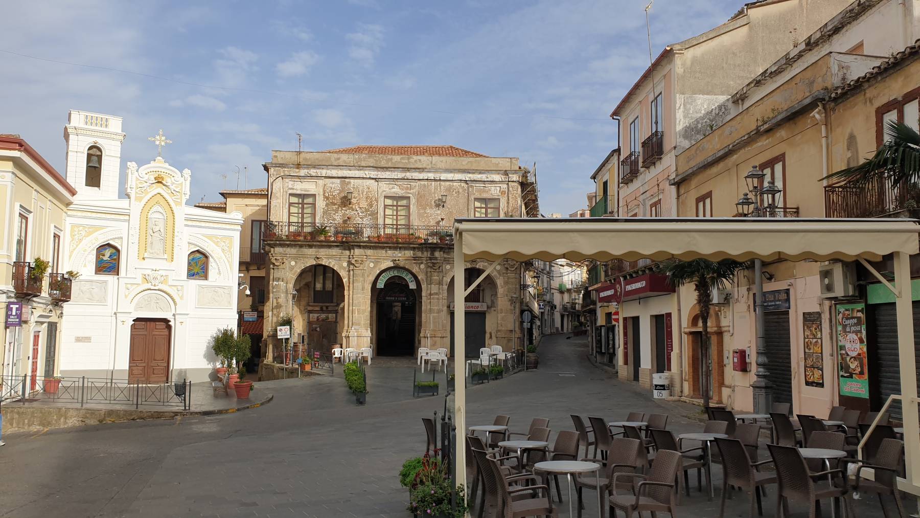 Nun geht es wieder auf die Küstenseite am ionischen Meer. In Catanzaro, der Hauptstadt Kalabriens, wollen wir ein wenig bummeln. Auf einem Parkplatz an der Standseilbahn, die in den Ort führt, ist ein Teil für Wohnmobile reserviert. Das klingt doch gut. Wir fahren durch hässliche, kaputte Straßen, vorbei an Brückenruinen und verrosteten Irgendetwas etc. Der Parkplatz ist gut gefüllt und groß und – völlig vermüllt. Wir hätten von hier aus einen schönen Blick auf die Hochhäuser auf dem Hügel Catanzaros und auf der anderen Seite die besagten Ruinen. Selbst das Gebäude der Standseilbahn aus den Vierzigern oder so, ist in erbärmlichen Zustand. Ich zu Anette: Willst du mit der Bahn da hoch? Schnell sind wir Richtung Küste und finden einen Platz am Meer.