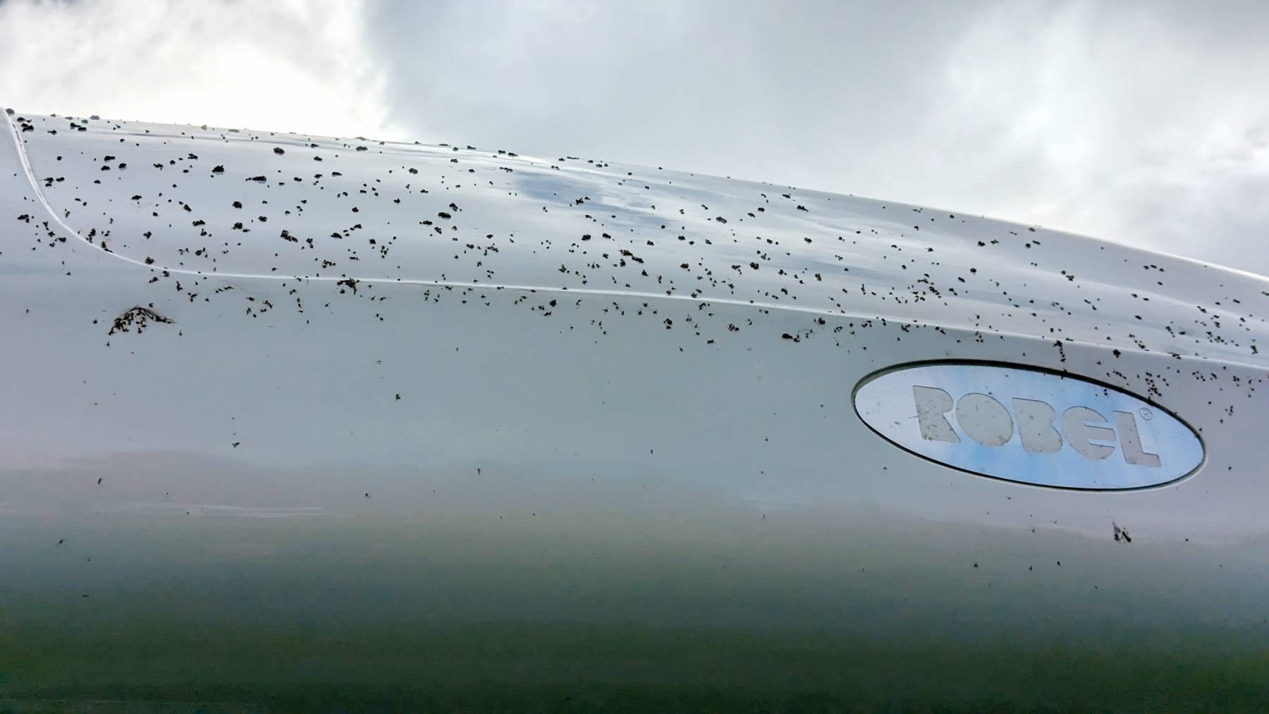 Und auf unserem ersten Platz in Schweden am nördlichen Ende des Bottnischen Meerbusens ist uns noch etwas Merkwürdiges passiert. Wir gehen am Morgen um unser Auto und staunen nicht schlecht. Auf der Motorhaube und am ganzen Alkoven alles voller Dreck. Wir gucken näher, kein Dreck, alles tote Insekten. Tausende, aber nur an den beiden Stellen. Wir gucken uns die Fotos vom Vorabend an, alles sauber. In der Nacht hat es viel geregnet, offensichtlich Insekten 🤷…