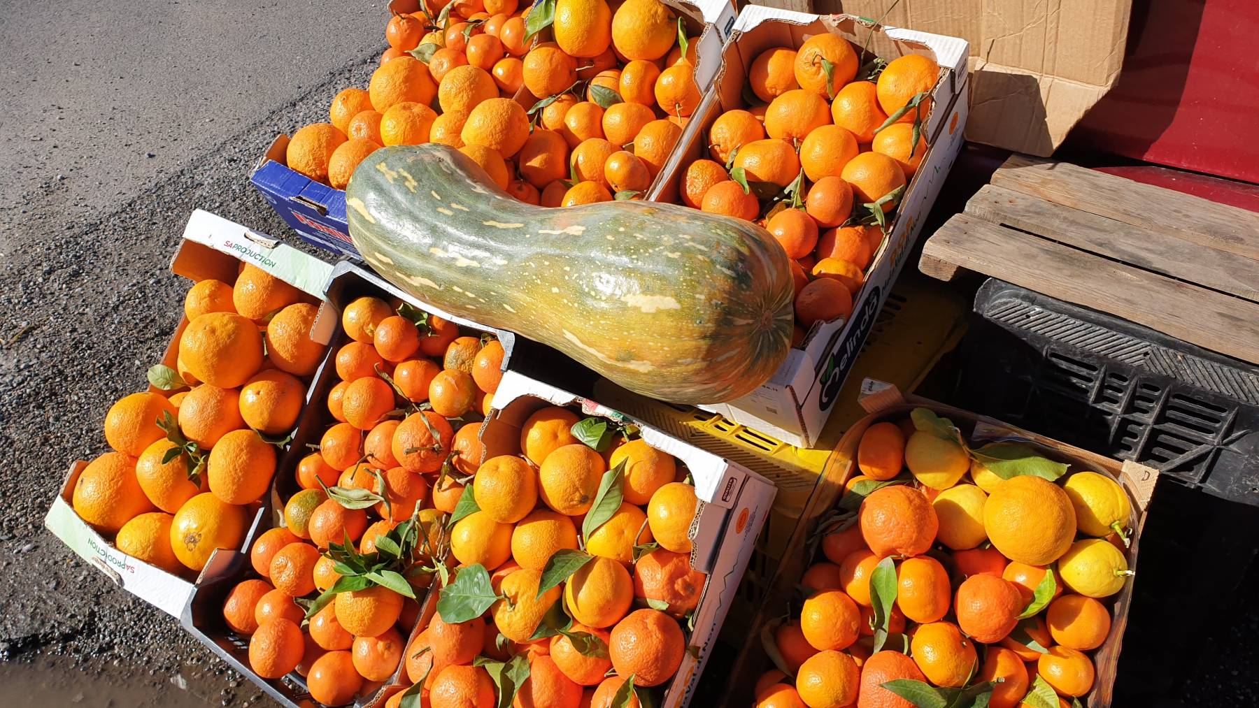 An der Straße verkaufen sehr viele Einheimische vor allem Orangen. Bei einem halten wir, er hatte natürlich früher mal ein Restaurant in Deutschland/Nürnberg. Eine Kiste Blutorangen und eine gemischte Kiste mit Clementinen und Orangen für jeweils € 10,–.  Nachdem wir dann noch im Supermarkt eingekauft haben, ist es schon wieder nach Mittag.