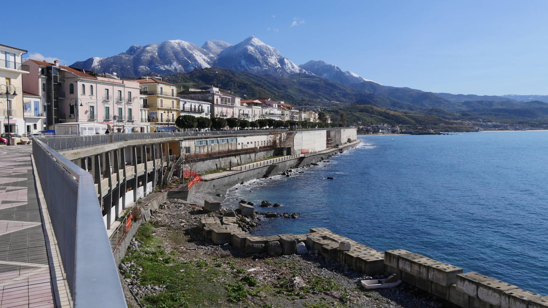 Den Küstenstreifen nach Norden würden wir als einen der schönsten von ganz Italien bezeichnen. Kristallklares Wasser, schöne Buchten umgeben von grünen Berghängen und schneebedeckten Gipfeln, sowie malerische gelegene Dörfer. Leider konnten wir uns einen, der Beschreibung nach sehr schönem Ort, Maratea, nicht angucken. Das letzte 10 km lange Stück ist wieder durch Betonhindernisse gesperrt, übrigens ohne vorherige Ankündigung. Wir müssten eine sehr bergige Straße durch enge Dörfer nehmen. Das ist es uns nicht wert.