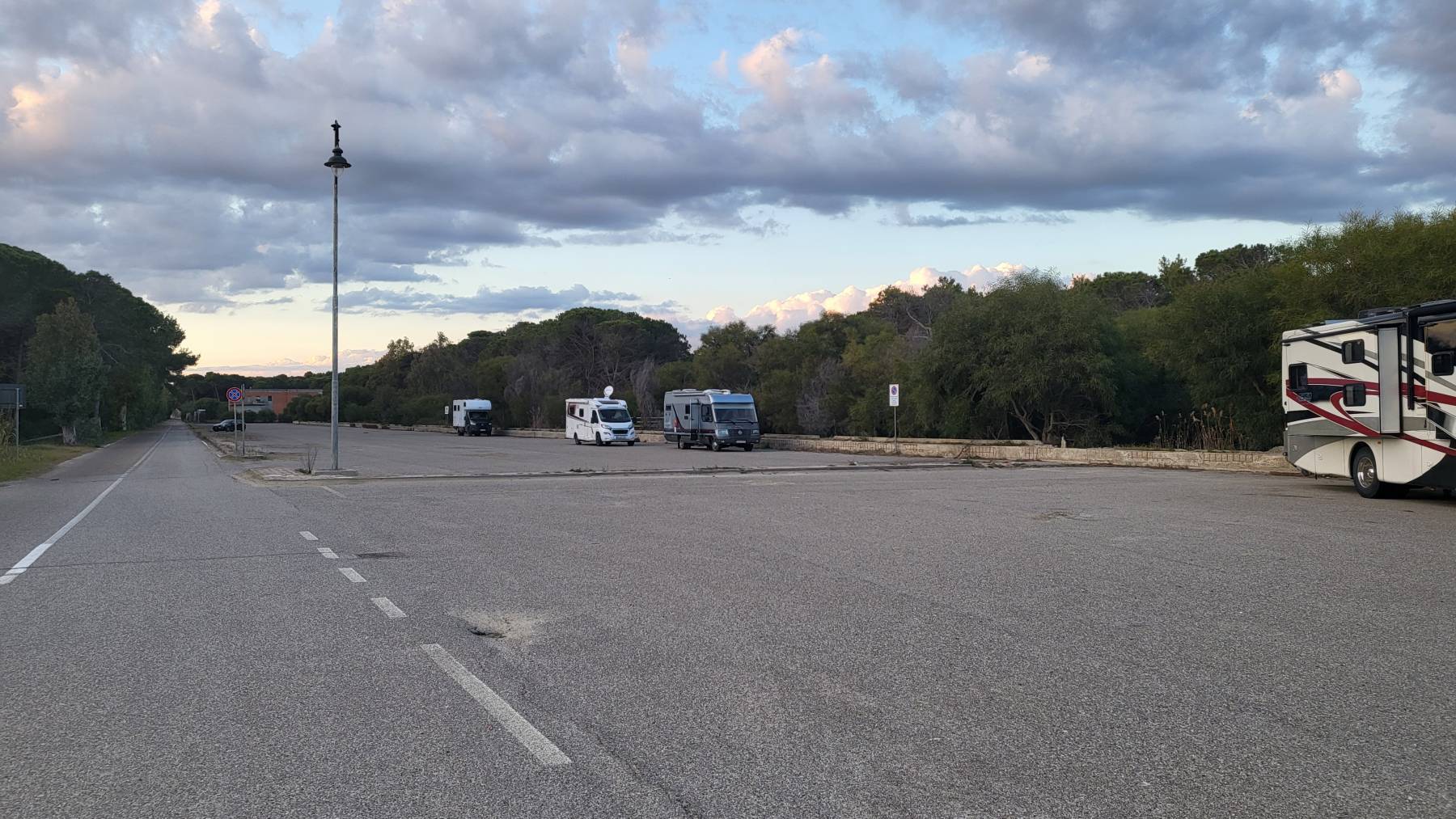 Wir sind jetzt in der Basilikata und wollen wieder auf die anders Seite. Das Ziel ist Apulien. Dafür müssen wir über die Berge. Jetzt merken wir, dass es Winter ist bzw. dieses Jahr es auch hier ausnahmsweise starke Schneefälle gegeben hat. Schon bei 300 m Höhe nimmt der Schnee zu, sodass auf 900 m Höhe eine Schneedecke bei 30 cm liegt. Zu unserer Überraschung sind die Straßen sehr gut geräumt, nur durch die Schneemassen enger. Hinter der Bergkette verschwindet der Schnee auf der Südseite vollends. Es sind für die kommenden Tage aber starke Regenfälle angesagt. Wir finden einen großen Asphaltplatz an einem Strand am Golf von Tarent. Wir sind überrascht: Das Parken ist im Grunde verboten, hier stehen aber sechs, teilweise sehr große Wohnmobile aus Deutschland. Und hier ist ein feiner sehr langen Sandstrand  –  völlig müllfrei 🤩.
