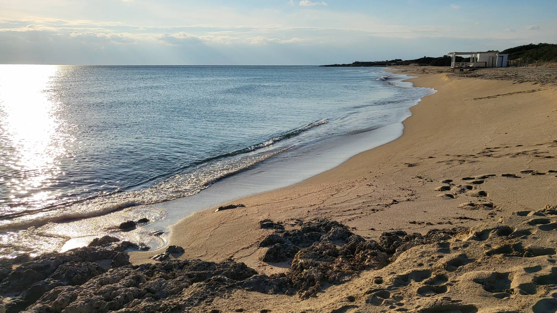 Wir sind jetzt in der Basilikata und wollen wieder auf die anders Seite. Das Ziel ist Apulien. Dafür müssen wir über die Berge. Jetzt merken wir, dass es Winter ist bzw. dieses Jahr es auch hier ausnahmsweise starke Schneefälle gegeben hat. Schon bei 300 m Höhe nimmt der Schnee zu, sodass auf 900 m Höhe eine Schneedecke bei 30 cm liegt. Zu unserer Überraschung sind die Straßen sehr gut geräumt, nur durch die Schneemassen enger. Hinter der Bergkette verschwindet der Schnee auf der Südseite vollends. Es sind für die kommenden Tage aber starke Regenfälle angesagt. Wir finden einen großen Asphaltplatz an einem Strand am Golf von Tarent. Wir sind überrascht: Das Parken ist im Grunde verboten, hier stehen aber sechs, teilweise sehr große Wohnmobile aus Deutschland. Und hier ist ein feiner sehr langen Sandstrand  –  völlig müllfrei 🤩.