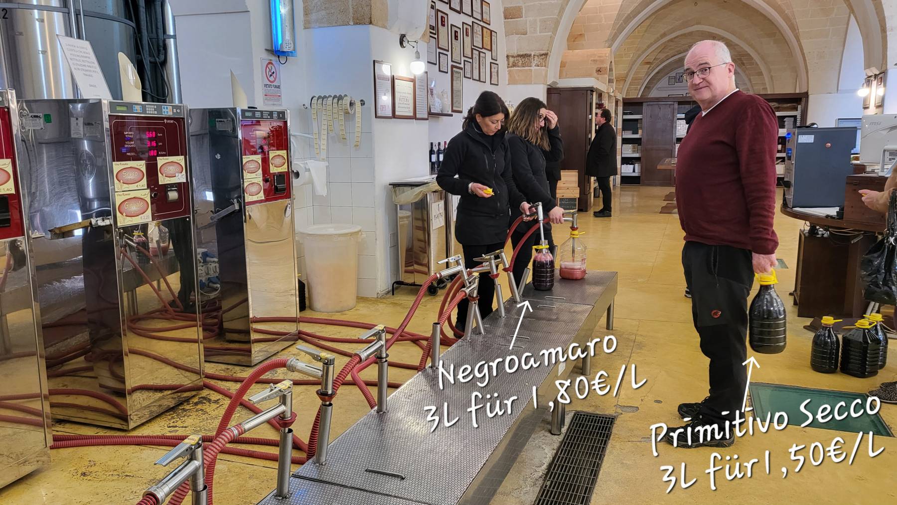 Primitivo di Manduria ist ein bekannter Rotwein aus dieser Gegend. Die Primitivo Traube ist genetisch identisch mit der Zinfandel Traube. Aus der Gegend um Manduria sollen dann die hochwertigsten Weine gekeltert werden. Also nichts wie hin.