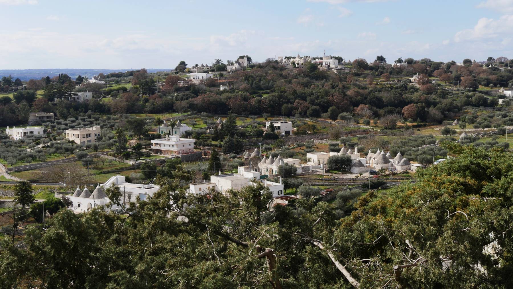 Wir befinden uns im Trulli-Land. Trullo (die Einzahl) bedeutet Kuppel und kommt aus dem Altgriechischen. Man ärgerte sich in diesem Gebiet vor langer Zeit über die Grundsteuer die an den König abgeführt werden musste. „Richtige“ Häuser wurden hoch besteuert und die kleinen, in dieser Region üblichen, Hirtenhütten nicht. Trulli wurden ursprünglich ohne Mörtel gebaut, weil man für Mörtellose Bauten keine Steuern zahlen musste, so ließen sie sich zur Not schnell wieder abbauen.