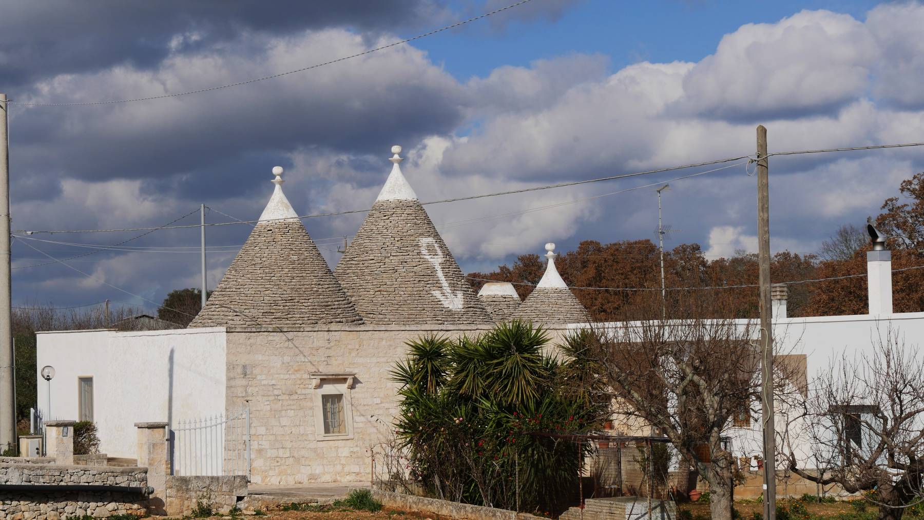Wir befinden uns im Trulli-Land. Trullo (die Einzahl) bedeutet Kuppel und kommt aus dem Altgriechischen. Man ärgerte sich in diesem Gebiet vor langer Zeit über die Grundsteuer die an den König abgeführt werden musste. „Richtige“ Häuser wurden hoch besteuert und die kleinen, in dieser Region üblichen, Hirtenhütten nicht. Trulli wurden ursprünglich ohne Mörtel gebaut, weil man für Mörtellose Bauten keine Steuern zahlen musste, so ließen sie sich zur Not schnell wieder abbauen.
