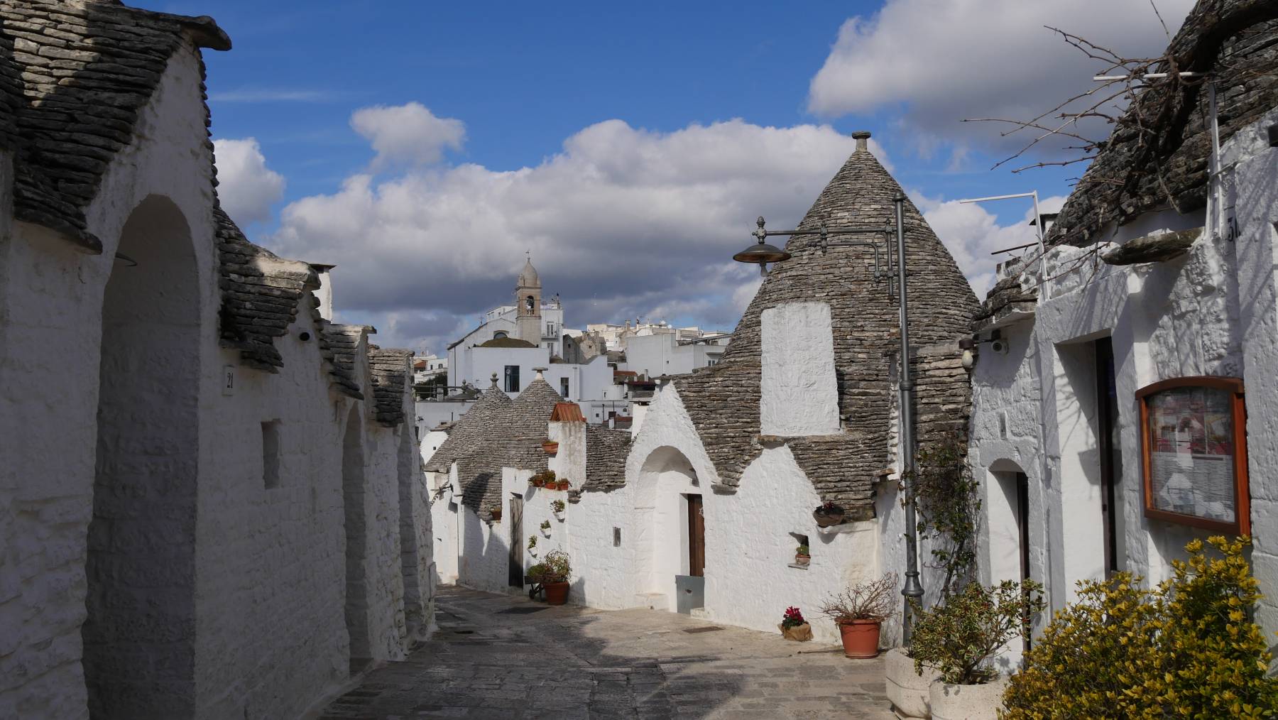 Wir befinden uns im Trulli-Land. Trullo (die Einzahl) bedeutet Kuppel und kommt aus dem Altgriechischen. Man ärgerte sich in diesem Gebiet vor langer Zeit über die Grundsteuer die an den König abgeführt werden musste. „Richtige“ Häuser wurden hoch besteuert und die kleinen, in dieser Region üblichen, Hirtenhütten nicht. Trulli wurden ursprünglich ohne Mörtel gebaut, weil man für Mörtellose Bauten keine Steuern zahlen musste, so ließen sie sich zur Not schnell wieder abbauen.