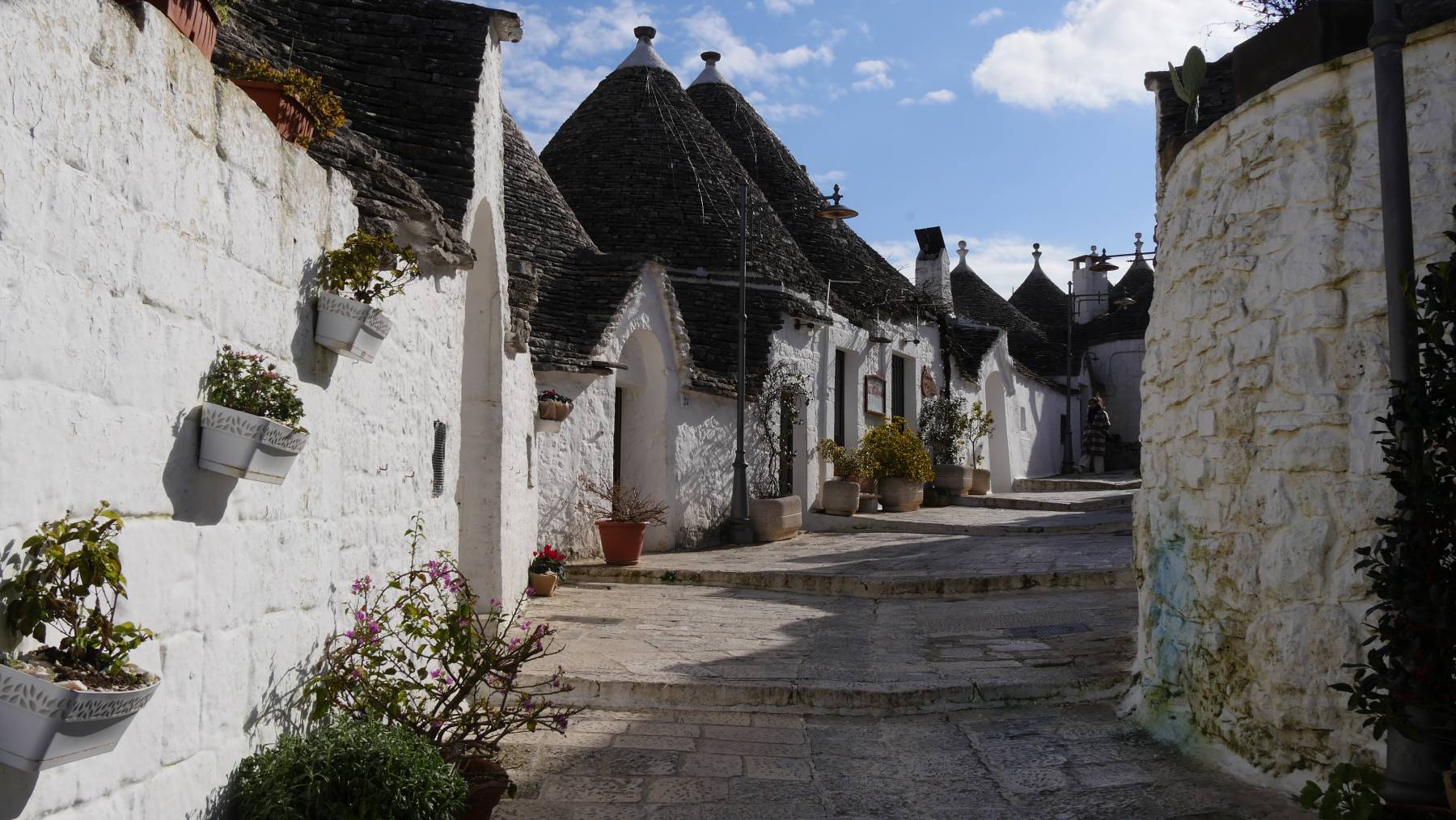 Wir befinden uns im Trulli-Land. Trullo (die Einzahl) bedeutet Kuppel und kommt aus dem Altgriechischen. Man ärgerte sich in diesem Gebiet vor langer Zeit über die Grundsteuer die an den König abgeführt werden musste. „Richtige“ Häuser wurden hoch besteuert und die kleinen, in dieser Region üblichen, Hirtenhütten nicht. Trulli wurden ursprünglich ohne Mörtel gebaut, weil man für Mörtellose Bauten keine Steuern zahlen musste, so ließen sie sich zur Not schnell wieder abbauen.