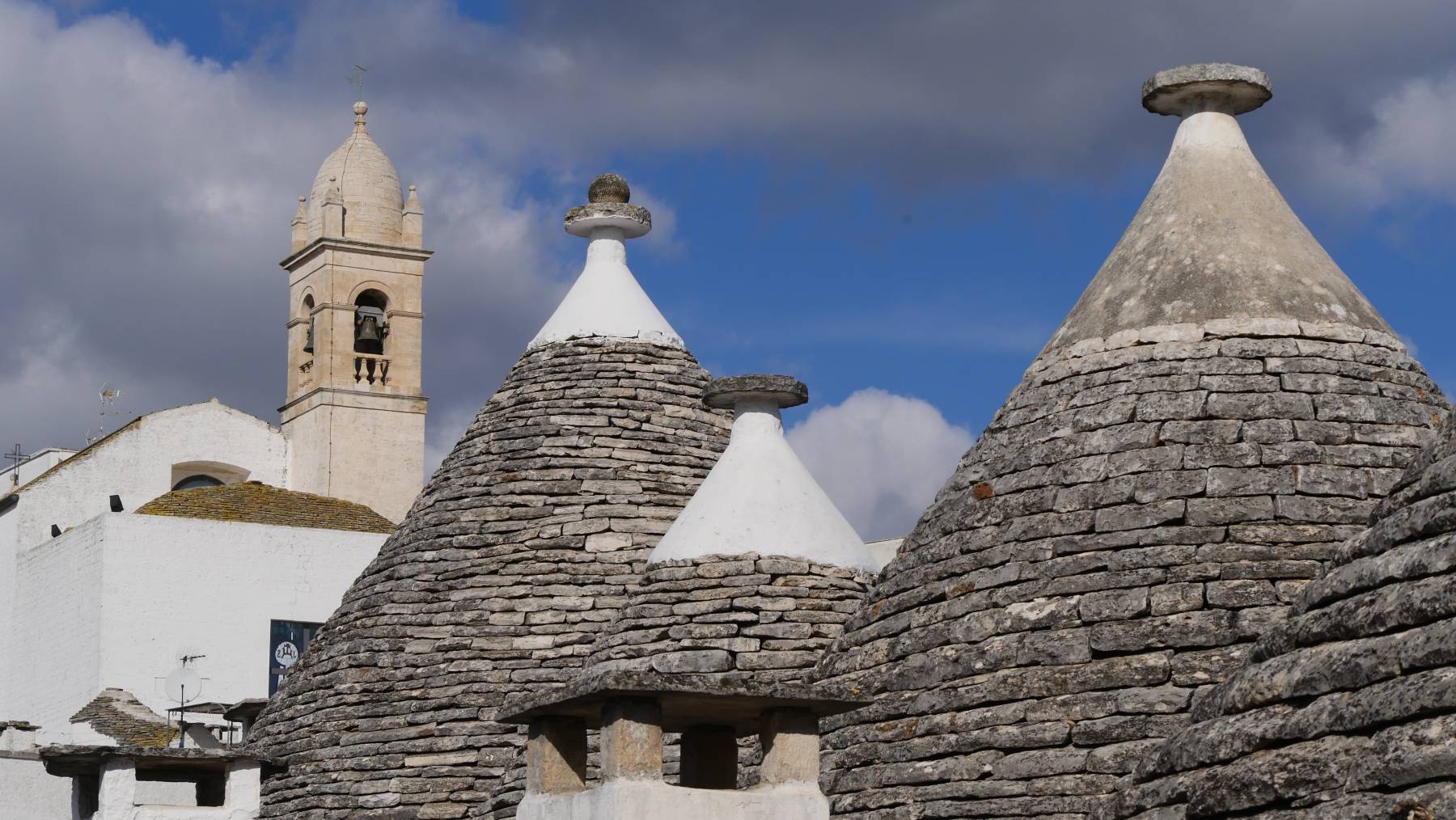 Wir befinden uns im Trulli-Land. Trullo (die Einzahl) bedeutet Kuppel und kommt aus dem Altgriechischen. Man ärgerte sich in diesem Gebiet vor langer Zeit über die Grundsteuer die an den König abgeführt werden musste. „Richtige“ Häuser wurden hoch besteuert und die kleinen, in dieser Region üblichen, Hirtenhütten nicht. Trulli wurden ursprünglich ohne Mörtel gebaut, weil man für Mörtellose Bauten keine Steuern zahlen musste, so ließen sie sich zur Not schnell wieder abbauen.