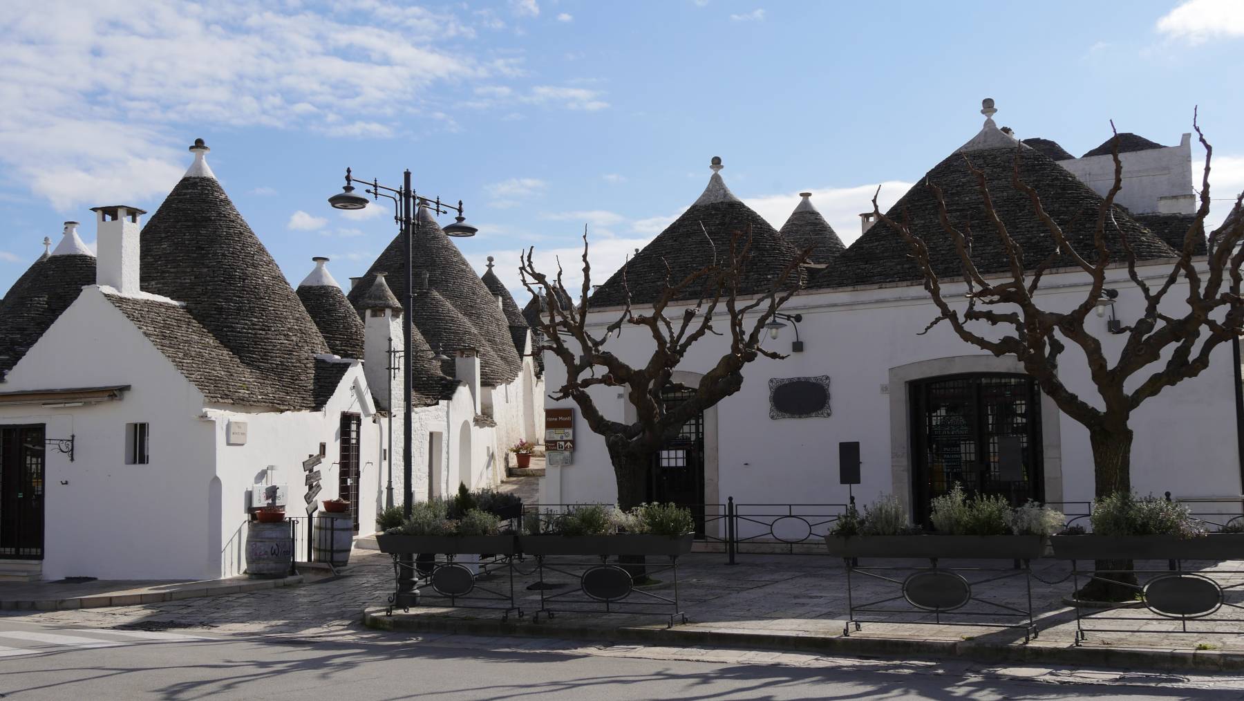Wir befinden uns im Trulli-Land. Trullo (die Einzahl) bedeutet Kuppel und kommt aus dem Altgriechischen. Man ärgerte sich in diesem Gebiet vor langer Zeit über die Grundsteuer die an den König abgeführt werden musste. „Richtige“ Häuser wurden hoch besteuert und die kleinen, in dieser Region üblichen, Hirtenhütten nicht. Trulli wurden ursprünglich ohne Mörtel gebaut, weil man für Mörtellose Bauten keine Steuern zahlen musste, so ließen sie sich zur Not schnell wieder abbauen.