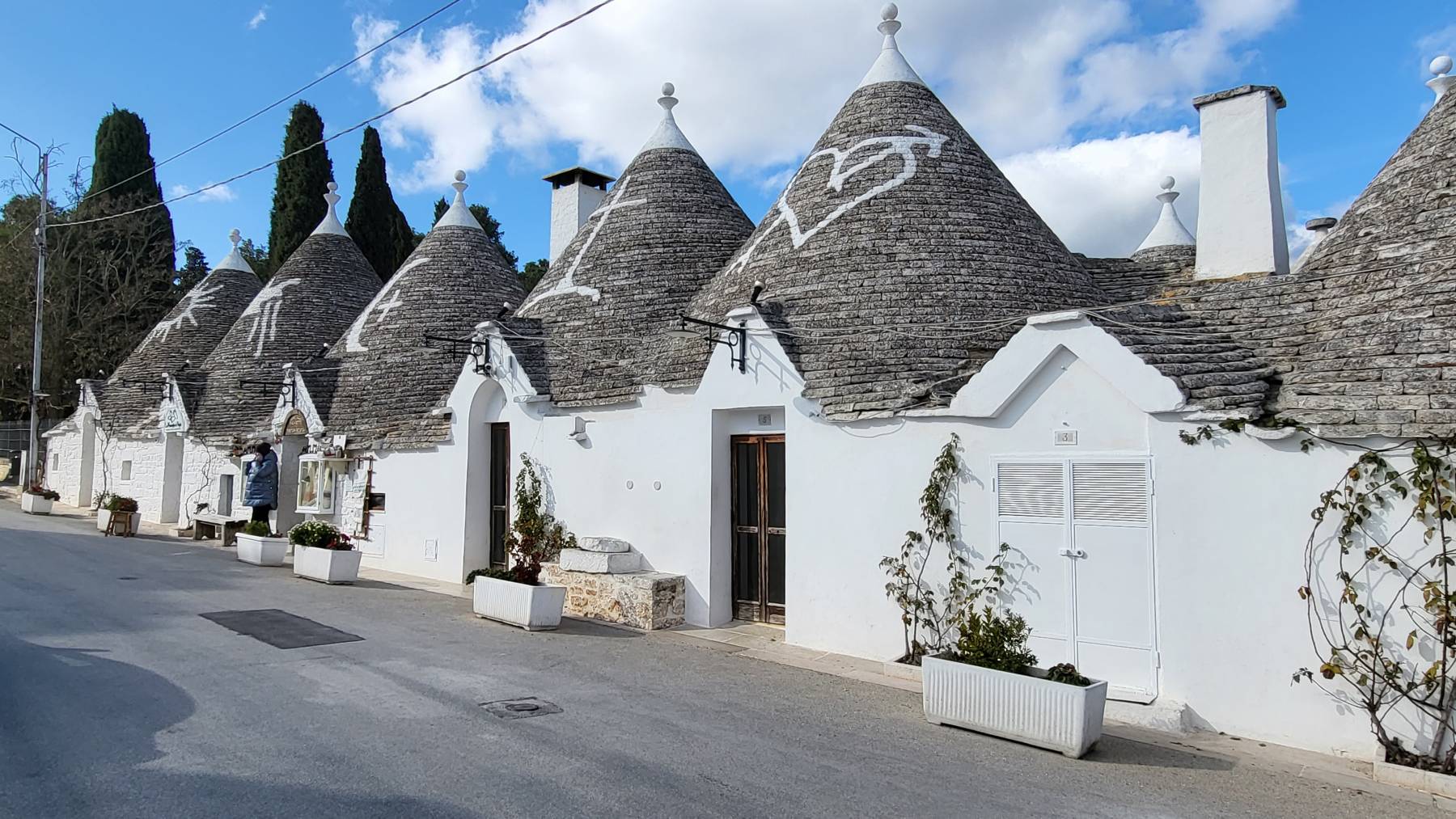 Wir befinden uns im Trulli-Land. Trullo (die Einzahl) bedeutet Kuppel und kommt aus dem Altgriechischen. Man ärgerte sich in diesem Gebiet vor langer Zeit über die Grundsteuer die an den König abgeführt werden musste. „Richtige“ Häuser wurden hoch besteuert und die kleinen, in dieser Region üblichen, Hirtenhütten nicht. Trulli wurden ursprünglich ohne Mörtel gebaut, weil man für Mörtellose Bauten keine Steuern zahlen musste, so ließen sie sich zur Not schnell wieder abbauen.