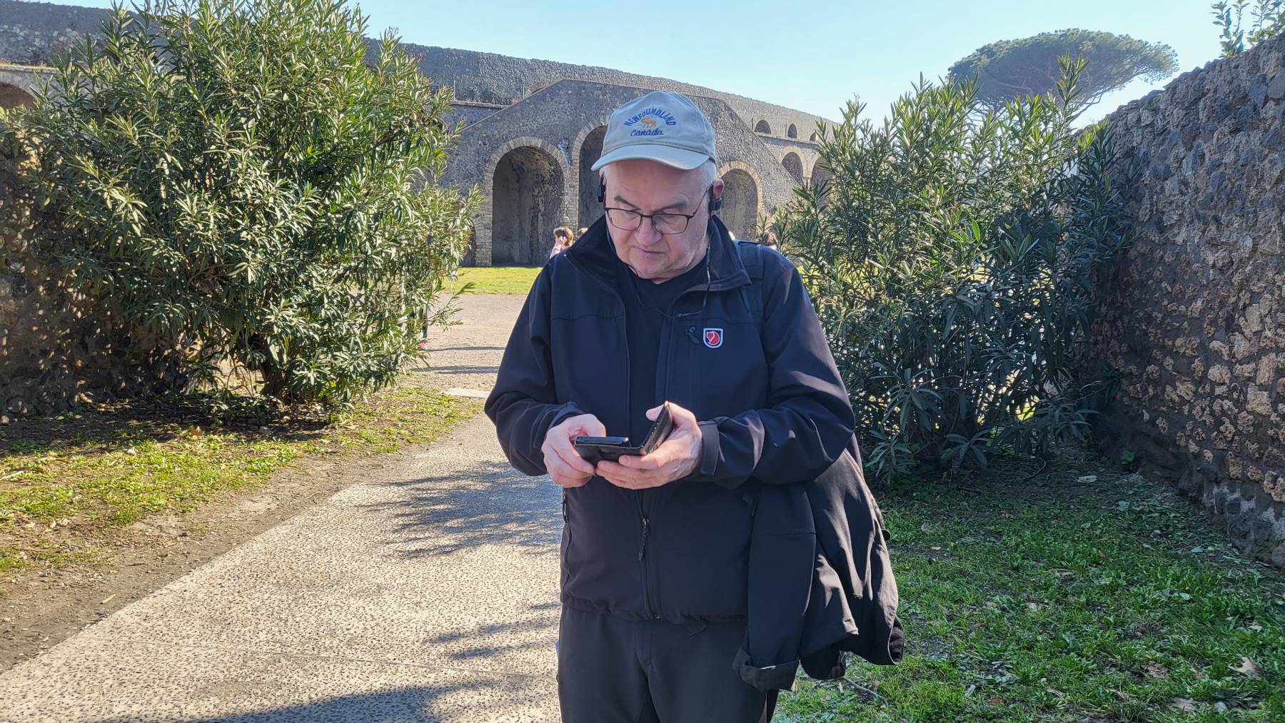 Den Besuch von Pompeji haben wir uns zur Pflicht gemacht. € 18,– p.P. schrecken uns hier nicht ab. An der Sicherheitskontrolle, wie am Flughafen, fallen wir dann auf. Der Scanner erkennt ein Taschenmesser in Anettes Rucksack. Wir durchwühlen alles und finden nichts. Er schiebt nochmal durch – und findet nichts. Also den Fotorucksack nochmal scannen, da ist es. Wir finden es nicht und holt es aus dem Rucksack, nach einem weiteren Scan. Gegen Quittung wird es bis 15.30 Uhr dort hinterlegt. Also haben wir über drei Stunden Zeit. Für das riesige Areal, mit Audioguide und den vielen eindrucksvollen Sehenswürdigkeiten ist das zu knapp, bekommen es aber um 15.37 Uhr mit Gnade ausgehändigt. Ansonsten erstaunt uns die extrem große Touristenanzahl.