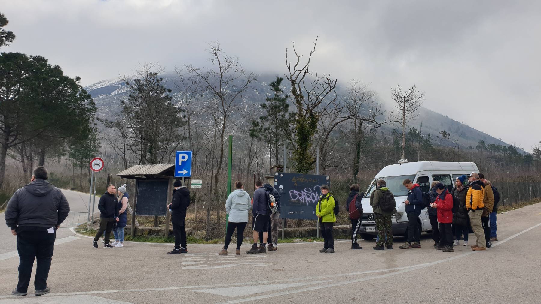 Auf den Vesuv kommst du nur mit einem Zeitfenster-Ticket, welches ausschließlich Online zu buchen ist. Das Internet ist da oben aber sehr bescheiden. Nach 60 Minuten und drei Versuchen mit verschiedenen Kreditkarten sind wir glückliche Inhaber von zwei e-Tickets für insgesamt € 23,36 für 12 Uhr. Wir müssen ja noch 4 km bergauf zum Eingang, mit privaten Fahrzeugen ist die Zufahrt zum Eingangsbereich nicht möglich. Natürlich quatscht uns nach 1 km an der einzigen Kreuzung ein Italiener an, ob wir nicht den Shuttle nutzen wollen, für € 3,– p.P. , sind ja noch 4 km bergauf und wir müssen nur 5 Minuten warten. Da man ab dem Eingangsbereich noch steil berghoch zum Kraterrand muss, entscheiden wir uns, wie zehn bereits wartendende, für die Komfortvariante. Ich brauche nicht zu erwähnen, dass wir 20 Minuten warten müssen und es tatsächlich nur 2 km bis zum Eingang sind.
