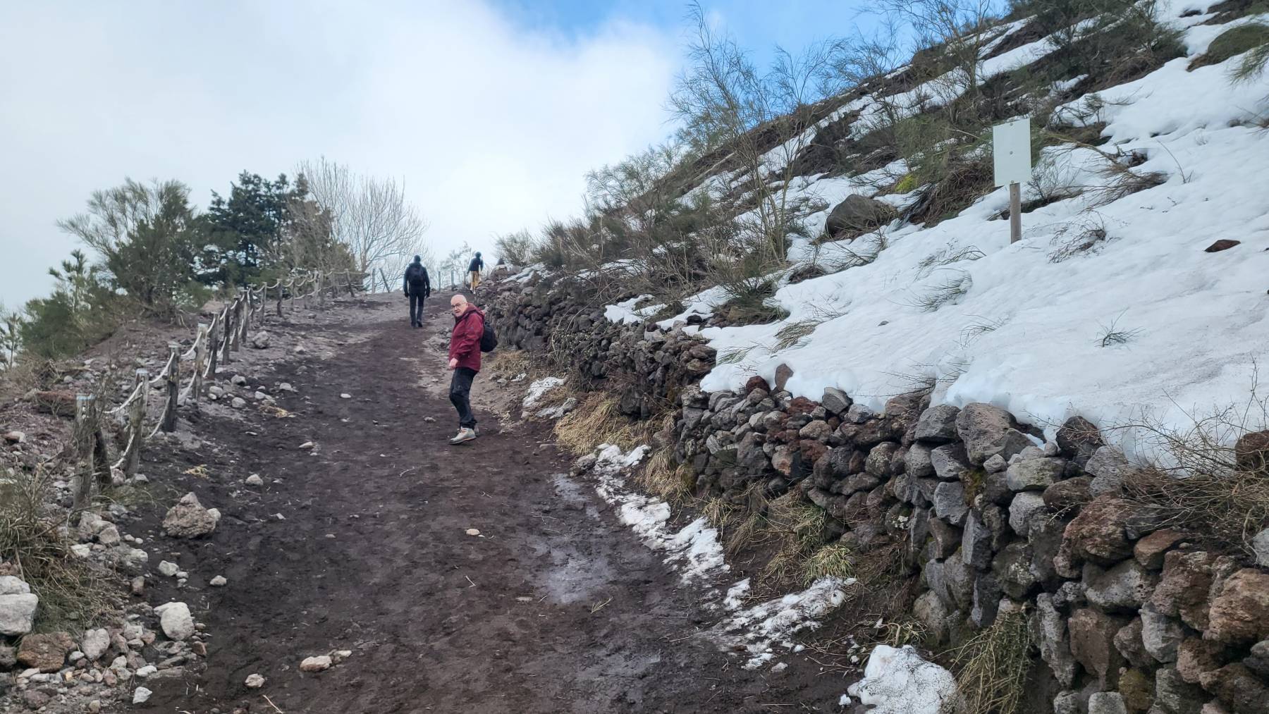 Wir lächeln uns das natürlich weg, denn der 1 km Rest-Weg zum Krater ist wirklich steil und auch anstrengend. Jetzt lernen wir doch den ersten Italiener kennen, der sich an Regeln hält. Unser Zeitfenster ist erst um 12 Uhr, wir sind zu früh – durch den Shuttlebus – und dürfen erst um 11.30 Uhr rein. Es ist albern, da wir beim buchen bereits gesehen haben, dass die Zeitfenster um uns herum alle frei waren. Auf dem Krater begegnen wir dann mehreren Schulkassen aus Spanien, England und Frankreich. Auch der Vesuv ist im Februar voll. Zudem ist es leider heute, stärker als vorausgesagt, bewölkt. Trotz allem finden wir den Blick in den Krater beeindruckend und den Aufwand dafür lohnenswert.