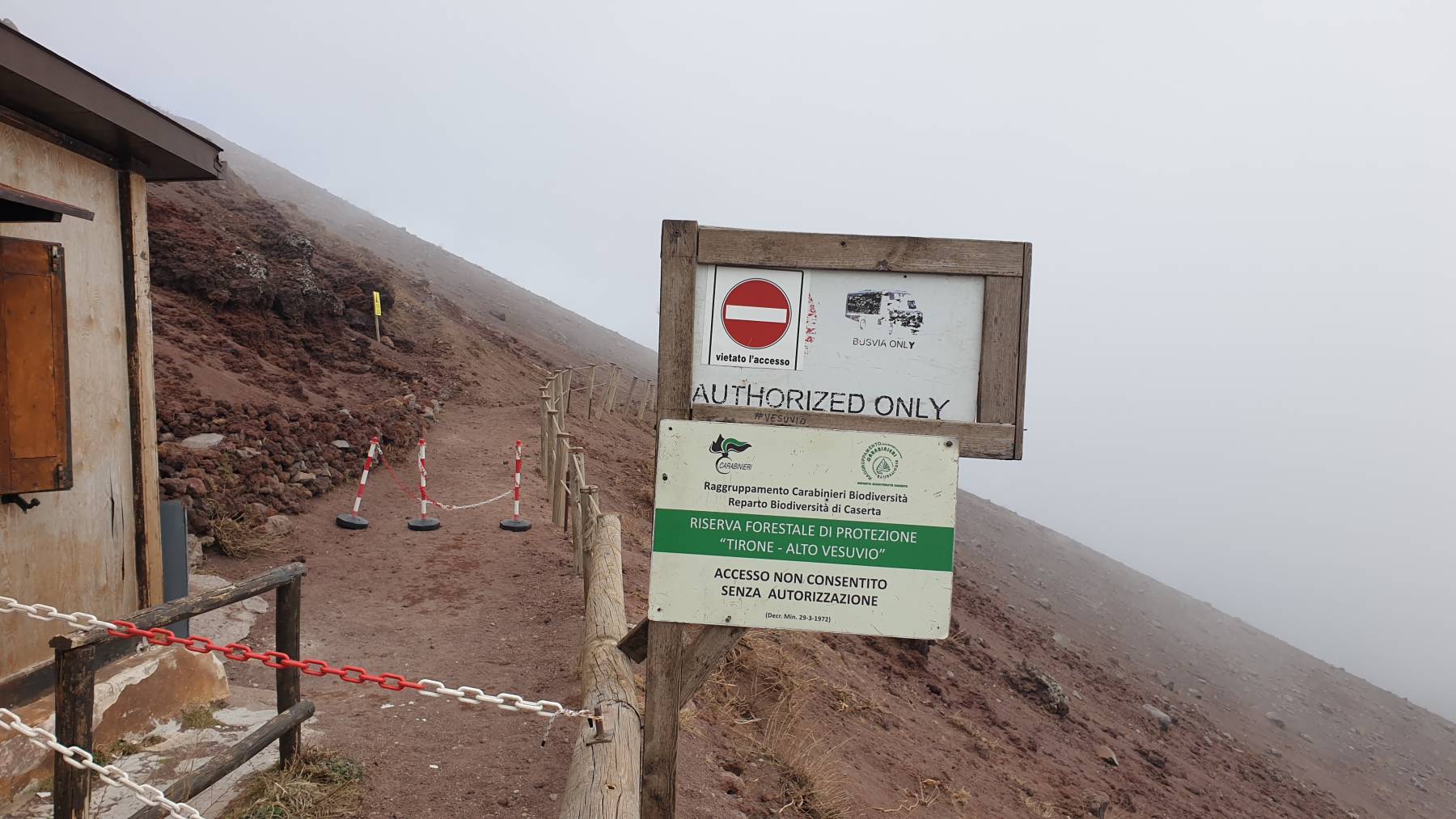 Auf den Vesuv kommst du nur mit einem Zeitfenster-Ticket, welches ausschließlich Online zu buchen ist. Das Internet ist da oben aber sehr bescheiden. Nach 60 Minuten und drei Versuchen mit verschiedenen Kreditkarten sind wir glückliche Inhaber von zwei e-Tickets für insgesamt € 23,36 für 12 Uhr. Wir müssen ja noch 4 km bergauf zum Eingang, mit privaten Fahrzeugen ist die Zufahrt zum Eingangsbereich nicht möglich. Natürlich quatscht uns nach 1 km an der einzigen Kreuzung ein Italiener an, ob wir nicht den Shuttle nutzen wollen, für € 3,– p.P. , sind ja noch 4 km bergauf und wir müssen nur 5 Minuten warten. Da man ab dem Eingangsbereich noch steil berghoch zum Kraterrand muss, entscheiden wir uns, wie zehn bereits wartendende, für die Komfortvariante. Ich brauche nicht zu erwähnen, dass wir 20 Minuten warten müssen und es tatsächlich nur 2 km bis zum Eingang sind.