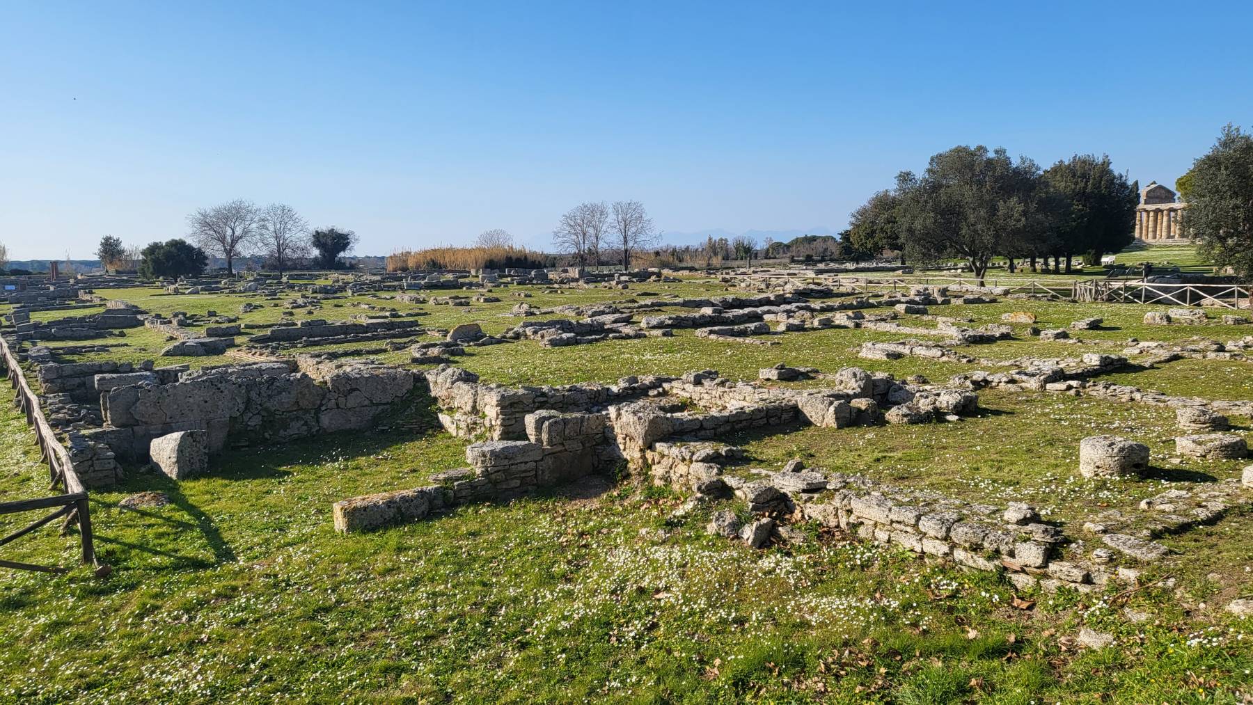 In der griechischen Ruinenstadt Paestum gilt unsere erste Aufmerksamkeit den drei dorischen Tempeln. Idealerweise können wir die ganze Anlage bereits von außen im Abendlicht sehr gut wahrnehmen. Tatsächlich sind wir gar nicht zu geizig für die € 6,– p.P. für den Wintertarif, aber nach einigen Besuchen antiker Ruinen, reicht uns der Blick.