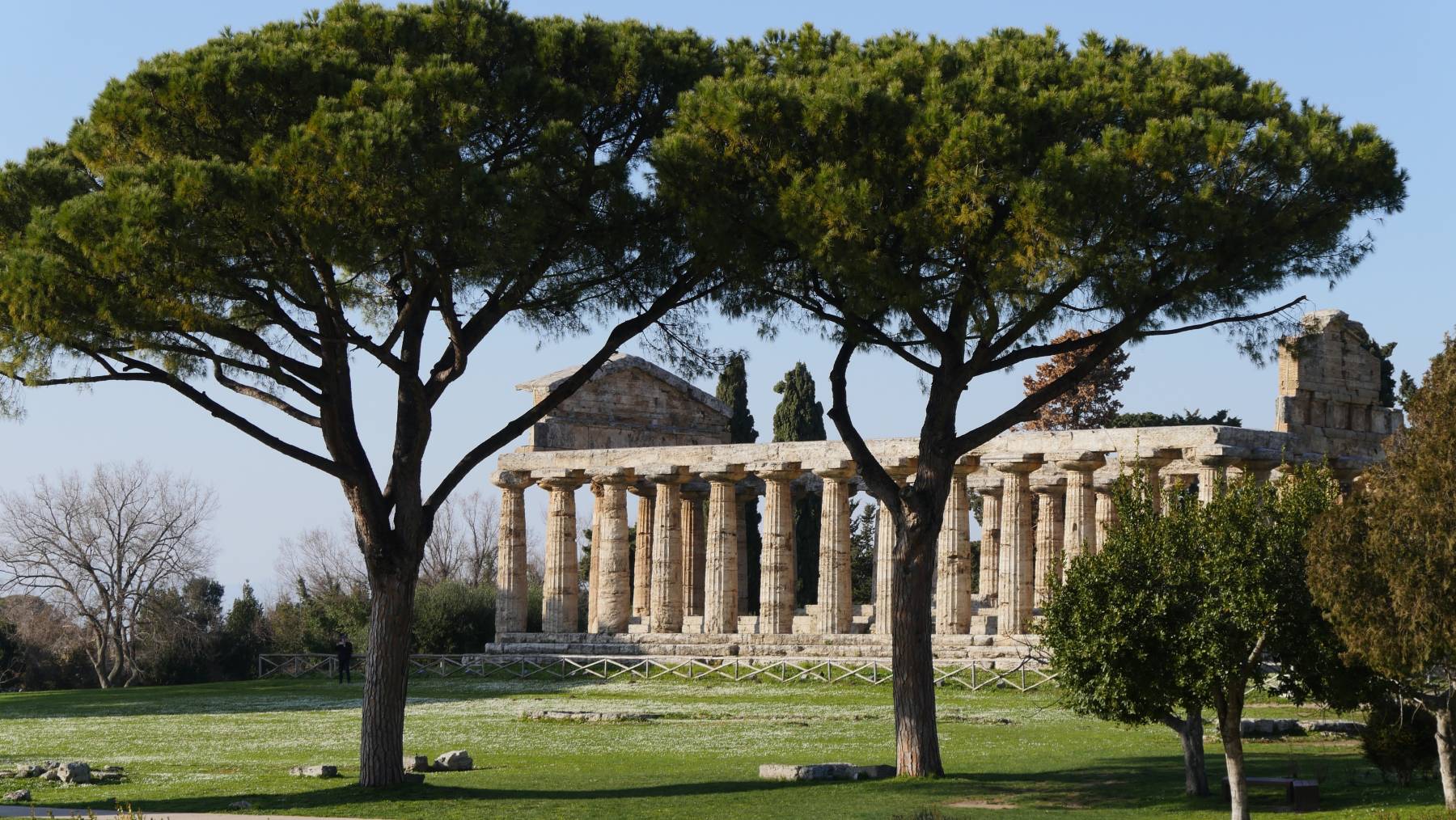 In der griechischen Ruinenstadt Paestum gilt unsere erste Aufmerksamkeit den drei dorischen Tempeln. Idealerweise können wir die ganze Anlage bereits von außen im Abendlicht sehr gut wahrnehmen. Tatsächlich sind wir gar nicht zu geizig für die € 6,– p.P. für den Wintertarif, aber nach einigen Besuchen antiker Ruinen, reicht uns der Blick.