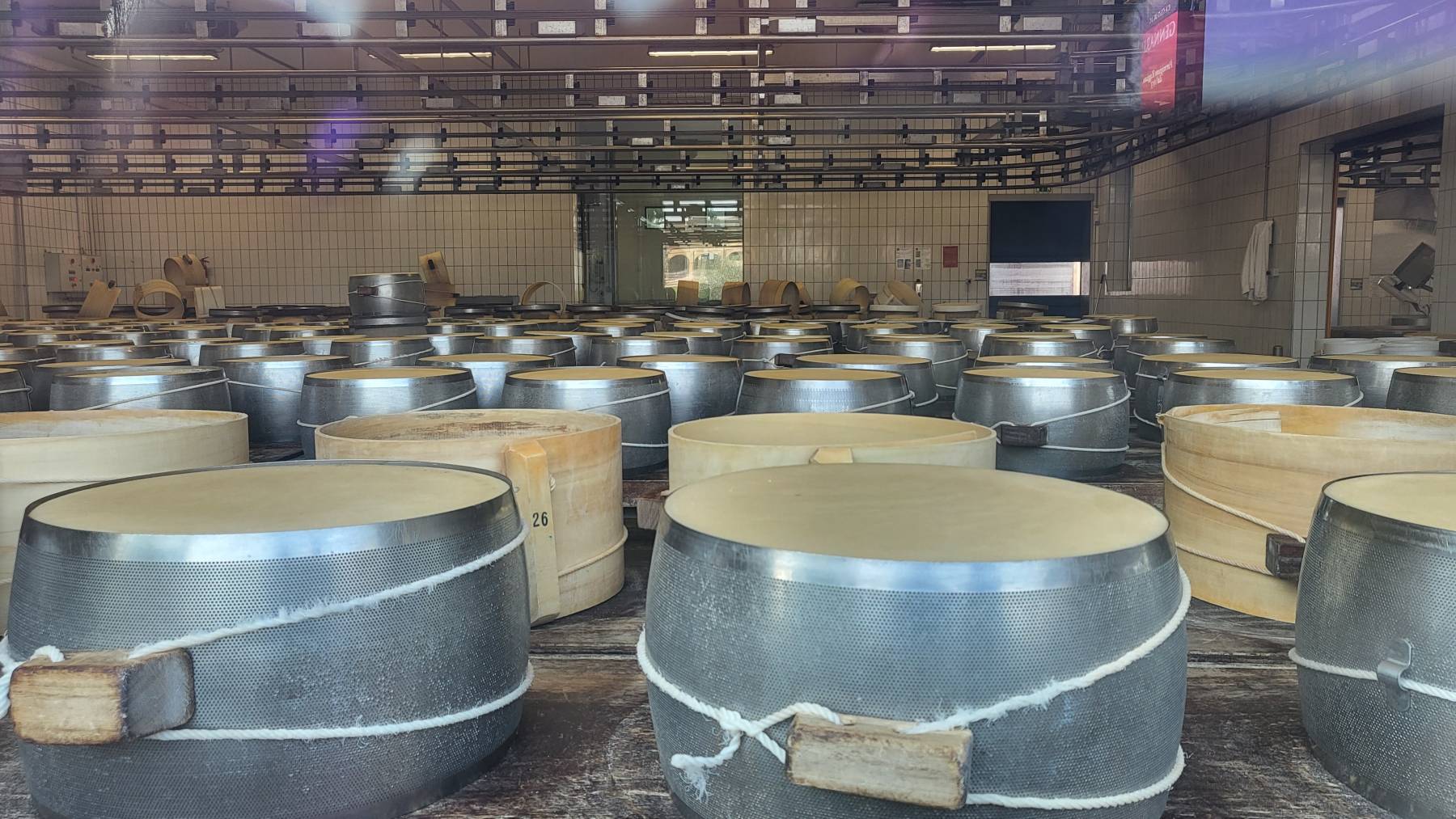 hier kann man durch die Schaufenster die Parmesanherstellung anschauen