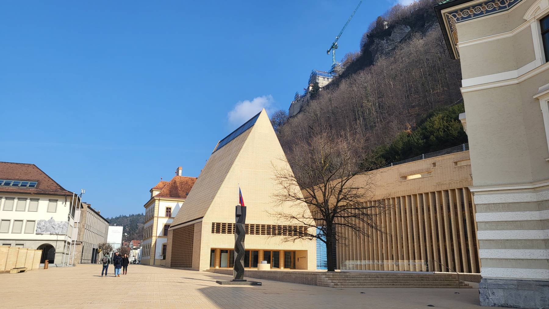 In Vaduz darf man auf dem Parkplatz des Stadions auch über Nacht stehen, für € 5,–. In dem Ort soll es nicht viel zu sehen geben, das Schloss kann man nicht besichtigen, da die Fürstenfamilie dort lebt. Die Erwartung ist also nicht hoch. Unser Spaziergang geht dann aber an der alten Rheinbücke vorbei, durch die mit Luxusgeschäften gespickte City insgesamt über 14 km hoch zu zwei Aussichtsplattformen.  Bei Sonnenschein und 9 Grad ein lohnenswertes Ziel.