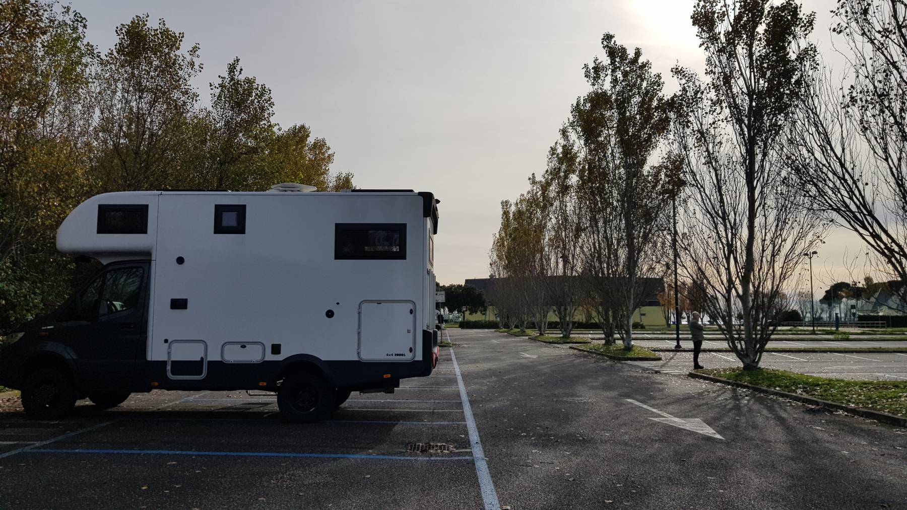 Nach den Einkäufen waschen wir in einem kleinen Waschsalon kurz noch ein bisschen Wäsche. Wir müssen noch nicht, aber die Gelegenheit ist da. Etwas südlich im Badeort Grado gibt es einen Stellplatz für € 16,– die Nacht. Es ist nach 17 Uhr und schon dunkel, aber das ist uns zu teuer. Gegenüber ist ein sehr großer Parkplatz. Laut App kostet es hier für die Nacht € 4,–. Also hin zum Automaten – kaputt, der nächste auch außer Betrieb wie der dritte. Das ist ein toller Platz 😜. Es stehen drei Womos auf dem riesigen Platz. Wir bleiben bis Samstagmorgen. Mittlerweile stehen hier über 25 Mobile. Die meisten sind Italiener. Das bedeutet es wird lauter, also weiter Richtung Venedig.